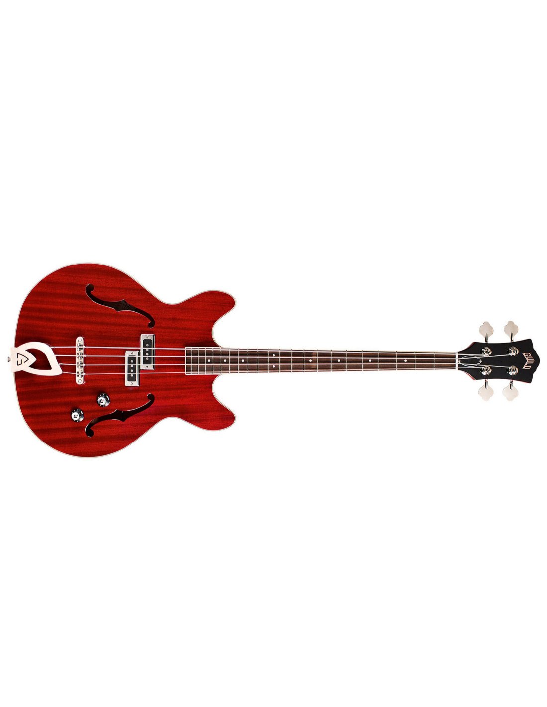 'An iconic shape at an affordable price, Guild's Starfire I Bass is a modern adaptation of the traditional Starfire Bass platform, offering the must-have features on a modern Hollowbody bass. Featuring a slim 2.4" body thickness, inwardly shifted neck, short scale length of 30 ¾” and a nut width of 1 ½”, the Starfire I Bass is a compact and affordable option for younger players or those who want more freedom on stage. Stable tuning and easy adjustment are provided by the Tune-o-matic bass bridge, and the harp-like tailpiece adds a touch of Guild's classic aesthetic, making the bass a descendant of its vertical ancestors. Guild's BC-1 BiCoil pickups adorn the bass, complete with nickel-resistant covers and Alnico 5 magnet construction. Combined with the woody nature of the semi-hollowbody tone and volume and tone control, these pickups allow the musician to dial in anything from modern, sharp bass tones to wooly, round, and vintage tones. Raising the volume knob reveals the vintage push-pull switch, a feature that adds presence with the low frequencies lowered, reminiscent of the parallel pickup configuration on vintage Hollowbody basses. Available with maple top, back and sides in vintage walnut, and with mahogany top, back and sides in cherry red. Left-handed version also available in Cherry Red. All in a perfectly glossy polyurethane finish. '