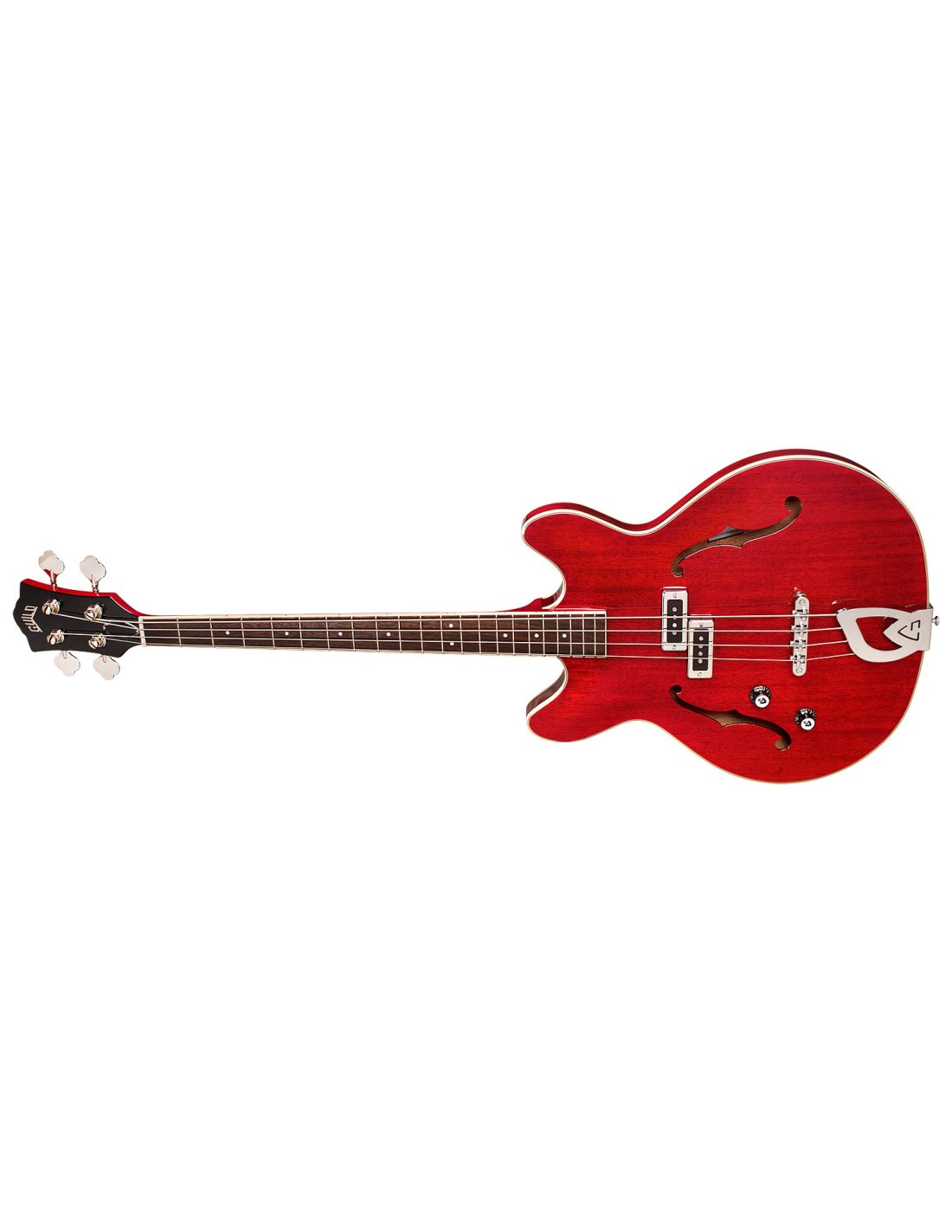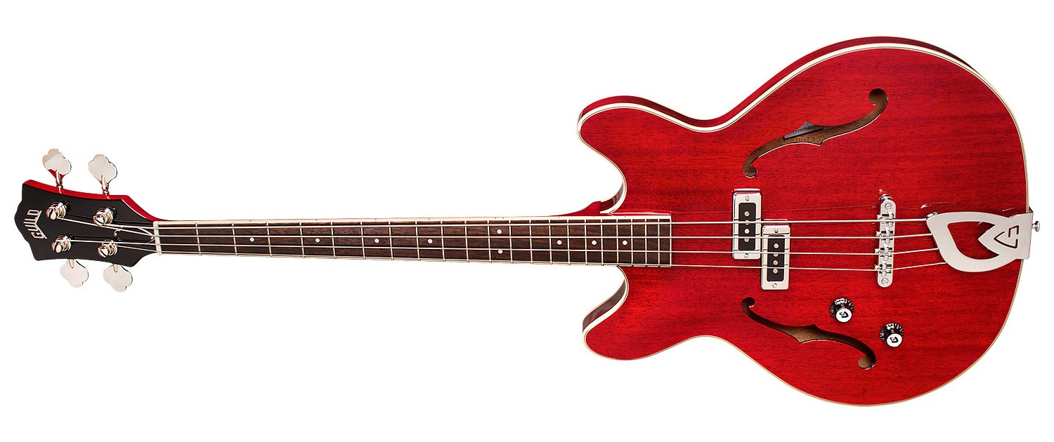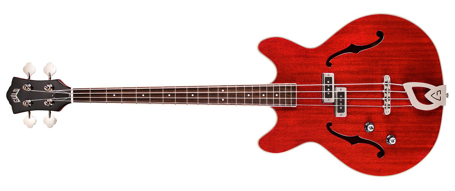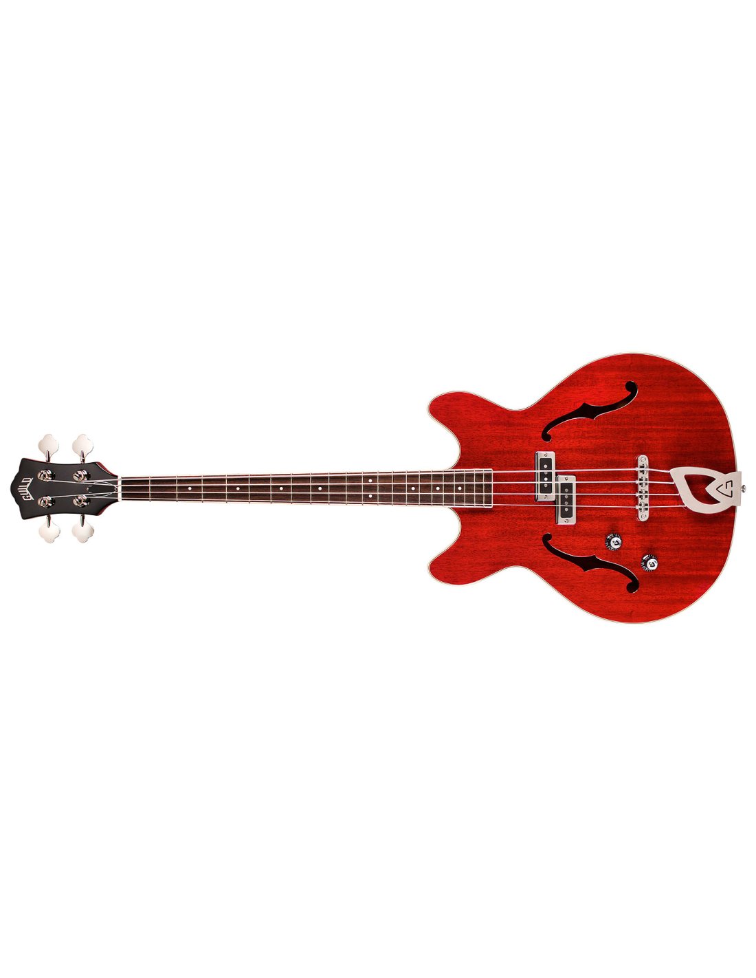 'An iconic shape at an affordable price, Guild's Starfire I Bass is a modern adaptation of the traditional Starfire Bass platform, offering the must-have features on a modern Hollowbody bass. Featuring a slim 2.4" body thickness, inwardly shifted neck, short scale length of 30 ¾” and a nut width of 1 ½”, the Starfire I Bass is a compact and affordable option for younger players or those who want more freedom on stage. Stable tuning and easy adjustment are provided by the Tune-o-matic bass bridge, and the harp-like tailpiece adds a touch of Guild's classic aesthetic, making the bass a descendant of its vertical ancestors. Guild's BC-1 BiCoil pickups adorn the bass, complete with nickel-resistant covers and Alnico 5 magnet construction. Combined with the woody nature of the semi-hollowbody tone and volume and tone control, these pickups allow the musician to dial in anything from modern, sharp bass tones to wooly, round, and vintage tones. Raising the volume knob reveals the vintage push-pull switch, a feature that adds presence with the low frequencies lowered, reminiscent of the parallel pickup configuration on vintage Hollowbody basses. Available with maple top, back and sides in vintage walnut, and with mahogany top, back and sides in cherry red. Left-handed version also available in Cherry Red. All in a perfectly glossy polyurethane finish. '