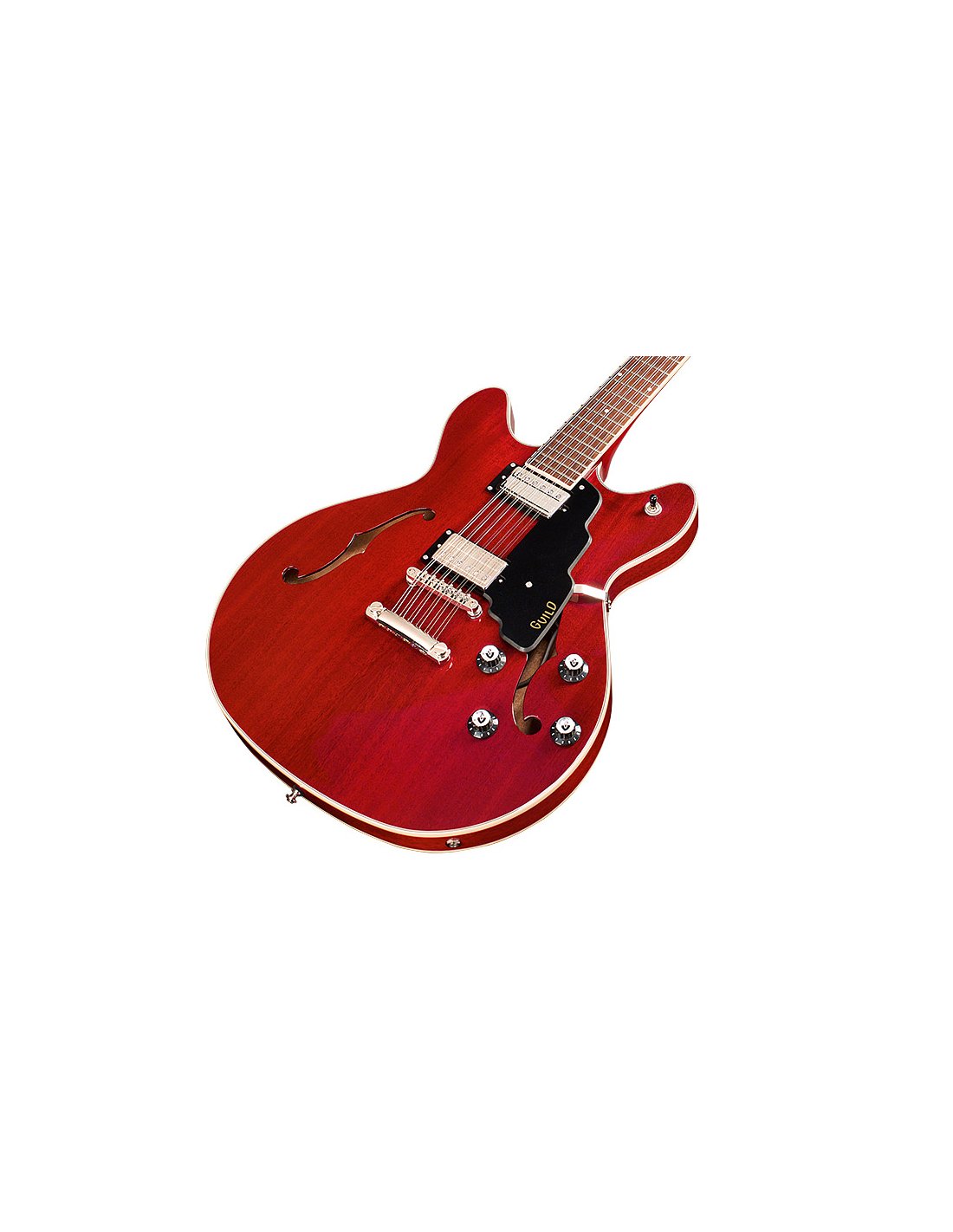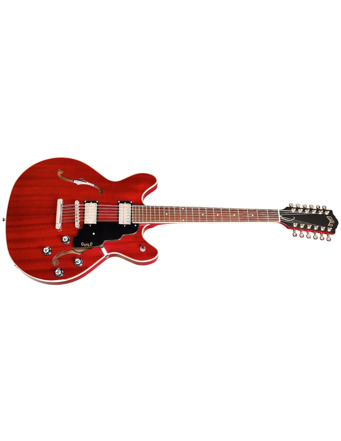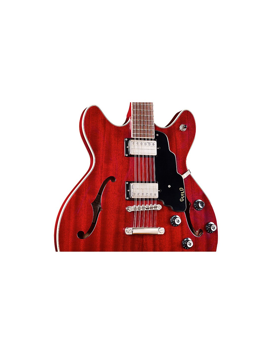 Inspired by the double cut shape made famous by the Starfire IV, V, and VI, the Starfire I-12 is a 12-string guitar with a semi-hollow body, made with a central mahogany block to reduce feedback and have excellent sustain. Starfire I-12 features an elegant arched (with two F) mahogany top, as well as the back and sides. The length of the scale is 24.75” (629 mm) the mahogany neck has a modern slim “U” profile for excellent playability. The Guild Vintage Premium Mechanics have a ratio of 18:1, the Tune-o-matic bridge with string attachment ensures easy tuning and great pitch hold. An injection of vintage sound is guaranteed by the Guild HB-2 Alnico II humbuckers, the push-pull allows you to split the pickup coils according to your needs. The bindings and purfling are made of ABS. Cherry Red glossy polyurethane finish.
