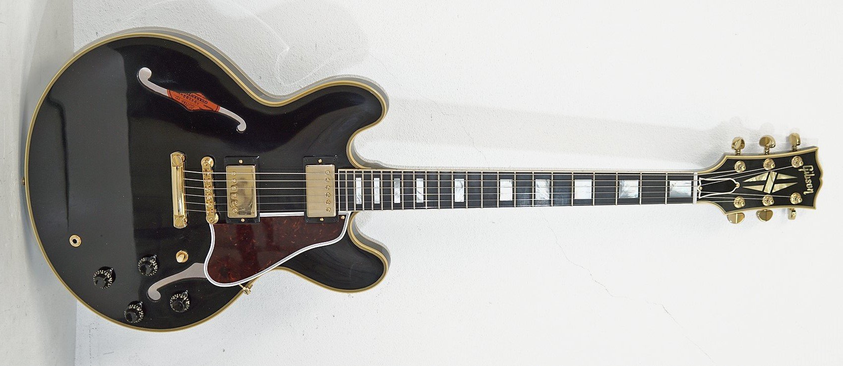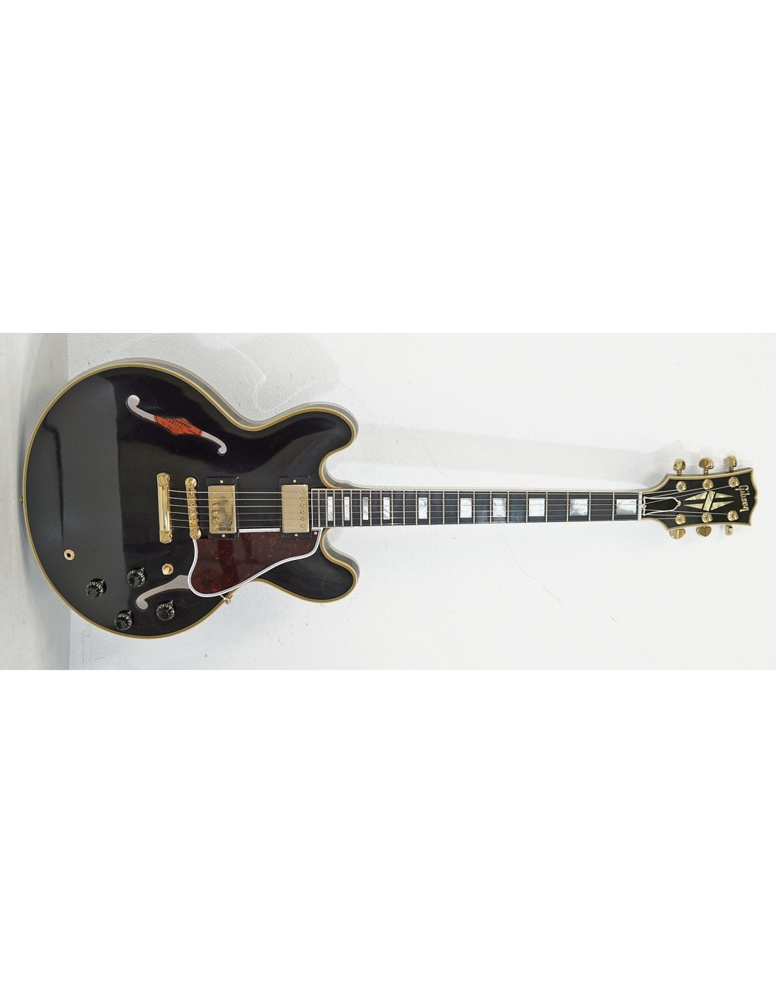 GIBSON 1959 ES-355 REISSUE EBONY. Gibson 1959 ES-355 Reissue Ebony Hollow-Body Electric Guitar with VOS (nitronecculous lacquer) finish. Technical features include 3-layer maple/poplar/maple body, solid mahogany neck with C-medium '59 profile, 12" radius Indian rosewood fingerboard and 22 Medium Jumbo frets, mother-of-pearl dot inlays. The electronics are equipped with 2 Custombucker Alnico 3 (unpotted) pickups with separate volume and tone controls for bridge and neck pickups, 500 k CTS conical potentiometers and paper-oil capacitors. It also features gold-plated hardware, ABR-1 No-Wire bridge, 1950s TrussRod No-Tube, Switchcraft 3-way pickup selector. Lifton Custom Shop hard case included