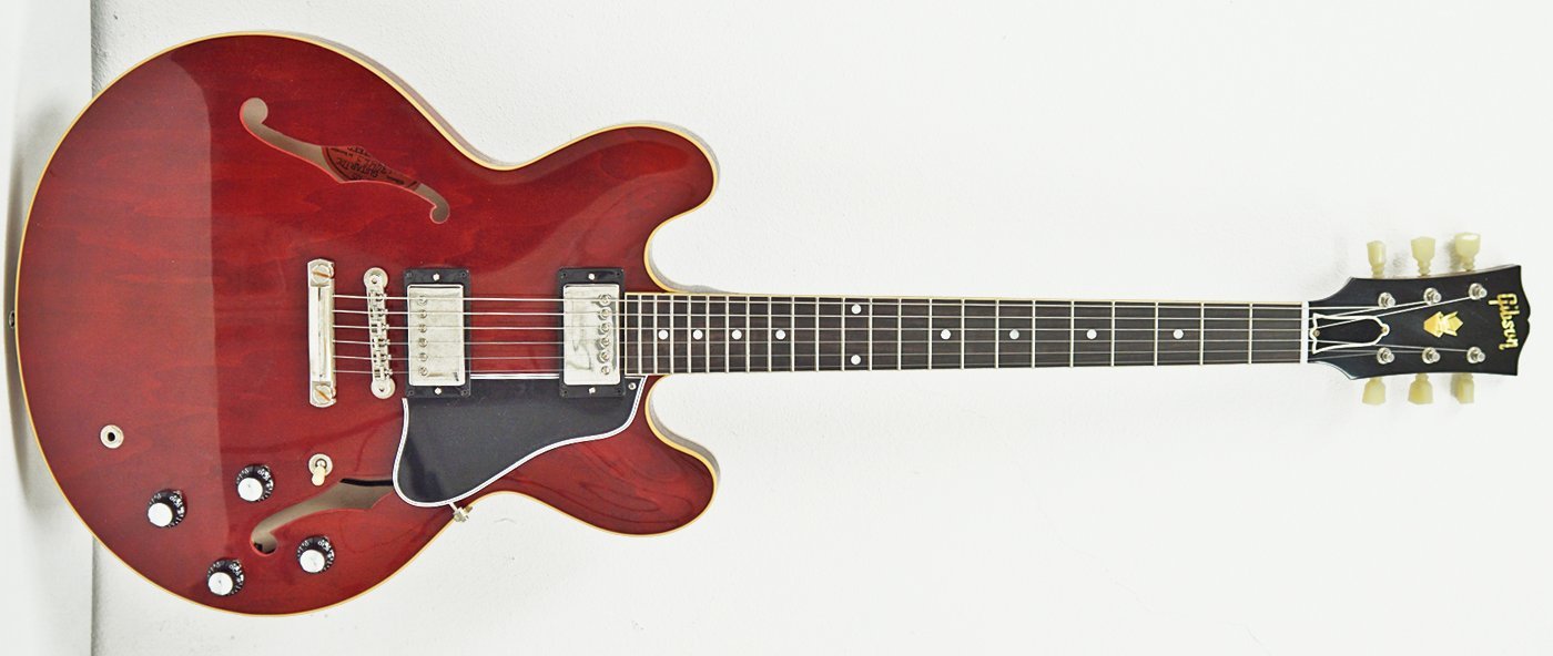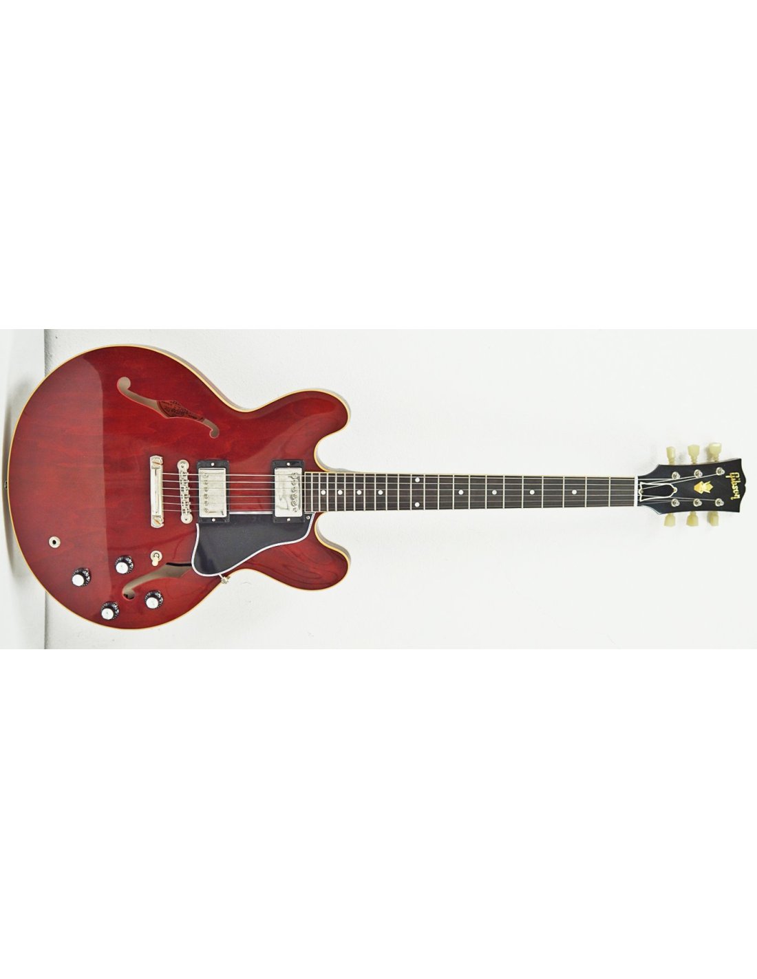 GIBSON 1961 ES-335 SIXTIES CHERRY VOS. Gibson 1961 ES-335 Sixties Cherry Hollow-Body Electric Guitar with VOS (nitronecculous lacquer) finish. Technical features include 3-layer maple/poplar/maple body, solid mahogany neck with C-skinny '61 profile, 12" radius Indian rosewood fingerboard and 22 Medium Jumbo frets, mother-of-pearl dot inlays. The electronics are equipped with 2 Custombucker Alnico 3 (unpotted) pickups with separate volume and tone controls for bridge and neck pickups, 500 k CTS conical potentiometers and paper-oil capacitors. It also features gold-plated hardware, ABR-1 No-Wire bridge, 1950s TrussRod No-Tube, Switchcraft 3-way pickup selector. Custom Shop black/yellow Hardshell hard case included