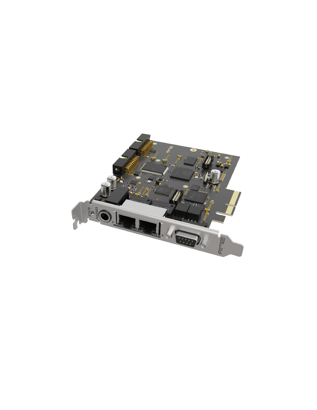 4-channel PCI Express card. MADI and Dante, 512 I/O channels, 24 bit/192kHz HDPSE AOXPCI Express audio interface with 512 channels, 4x MADI, Dante or AVB-Milan compatible. The HDSPe AoX (AVB) and HDSPe AoX-d (Dante) audio interfaces are the 2 new RME solutions for audio over IP in PCIe x4 format, equipped with 2 network ports, a headphone output and AES3 and MIDI ports, in addition to SteadyClock™ technology for all digital inputs and the possibility of being expanded with up to four optional MADI ports. Whether used in a Thunderbolt expansion chassis or installed in the workstation or inside dedicated audio processors, these cards send and receive up to 512 audio channels and offer extensive capabilities of mixing and routing through TotalMix.PCIE I/O connections: 512/256/128 channels with 48/96/192 kHz sample rates1x stereo headphone output, 1⁄4” TRS4 x MADI I/O (included coaxial BNC and optional SFP optical modules) AES3 I/O on DB9-XLR2 x RJ45 breakout cable 1 GigeWord Clock I/O (BNC) MIDI I/O on DB9 breakout cable - 2x DIN