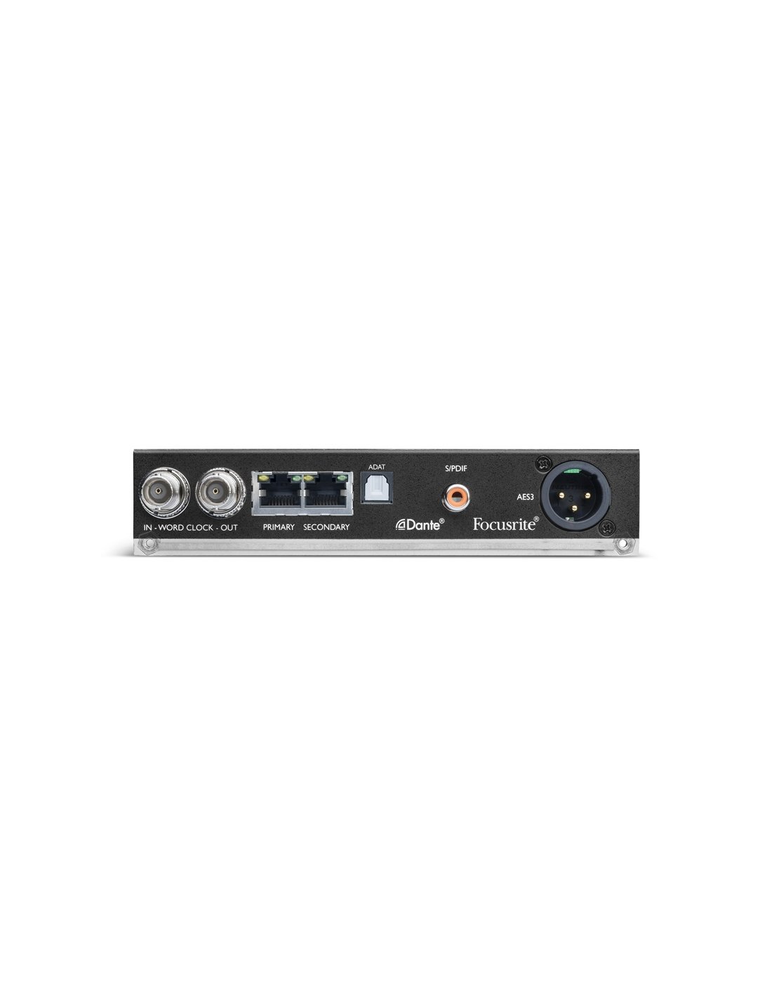 This card offers Primary and Secondary RJ45 connections for integration into audio systems that use DANTE connectivity, an XLR connector for AES3 output, a TOSLINK socket for ADAT output, and an RCA connector for the coaxial S/PDIF standard. Two BNC connectors are respectively dedicated to the input and output for Word Clock synchronization when inserted into chains of digital audio devices. Syncing to the DANTE network or synchronizing other tools external to the DANTE network is also supported. The Dante outputs on the ISA ADN2 card allow network connection to all Focusrite devices of the RedNet series and to the Red interfaces, or to any other Dante-equipped audio instrument on the market.