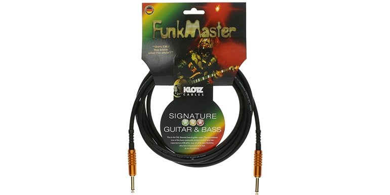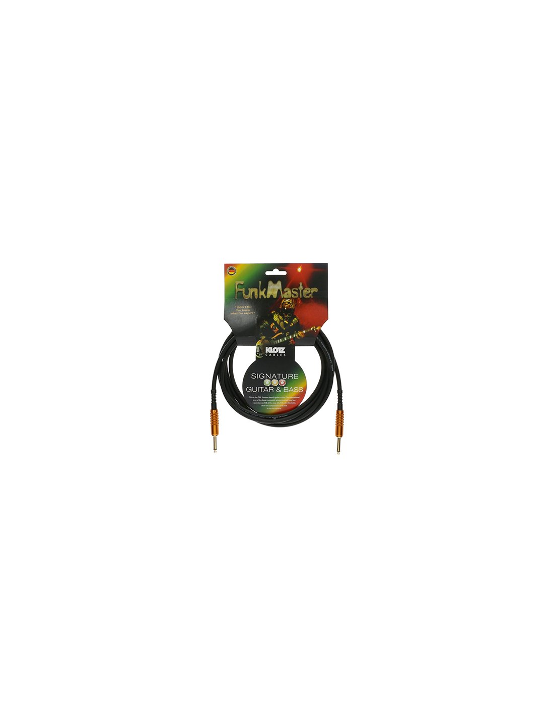 KLOTZ FunkMaster series JACK/JACK 90° bass/guitar cable. The cable is 9.0 meters long. It offers ultra-low signal compression and capacitance that minimizes signal disturbances. The FunkMaster is also designed for increased resistance to mechanical stress