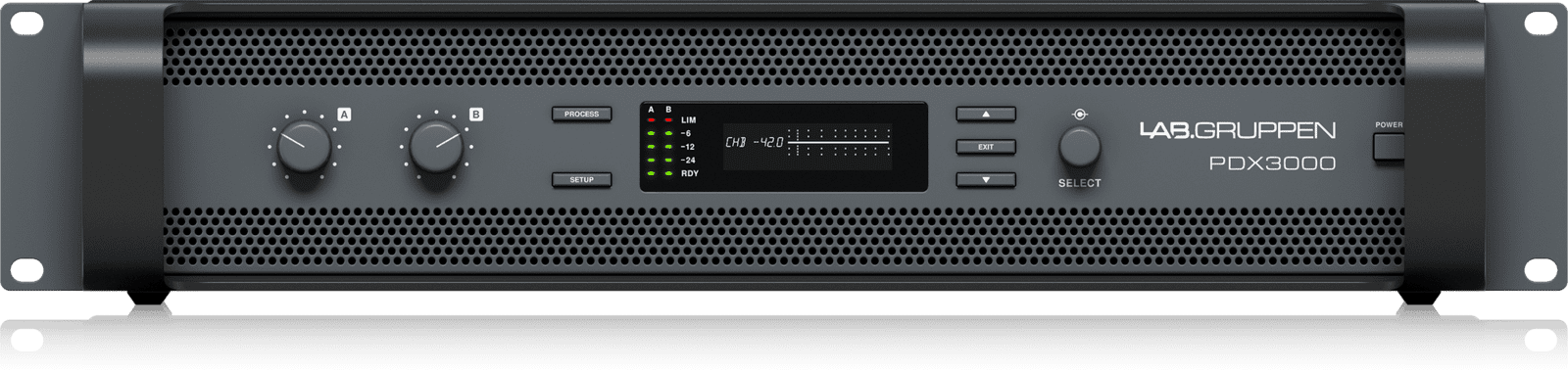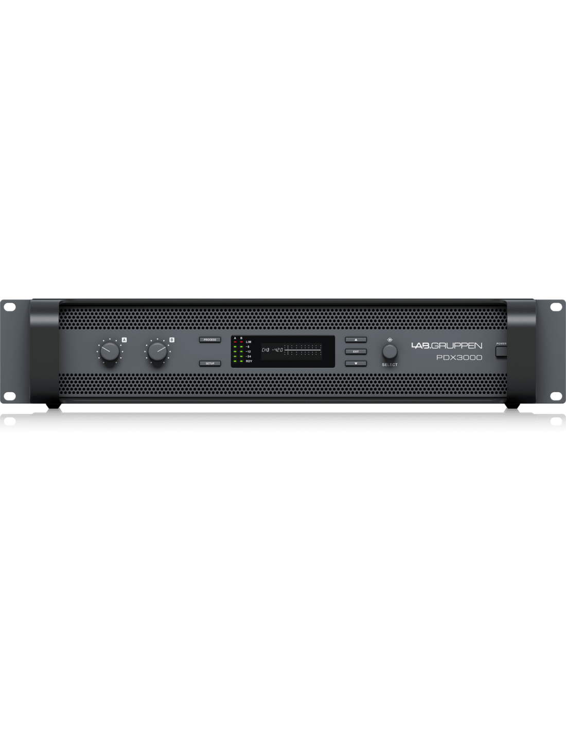 The PDX3000 is a two-channel amplifier with DSP control and provides 2x1500 Watts of power for medium/high level live audio applications. The PDX series amplifiers use the unique IDEEA Class D output stage developed by LabGruppen that is ideally adapted to the nominal power. To provide flexibility, each channel offers sufficient voltage and current capacity oscillations to drive loads at any impedance without any additional configuration. In order to have low thermal losses as well as a high voltage fluctuation, the project is based on a permanently bridged output |