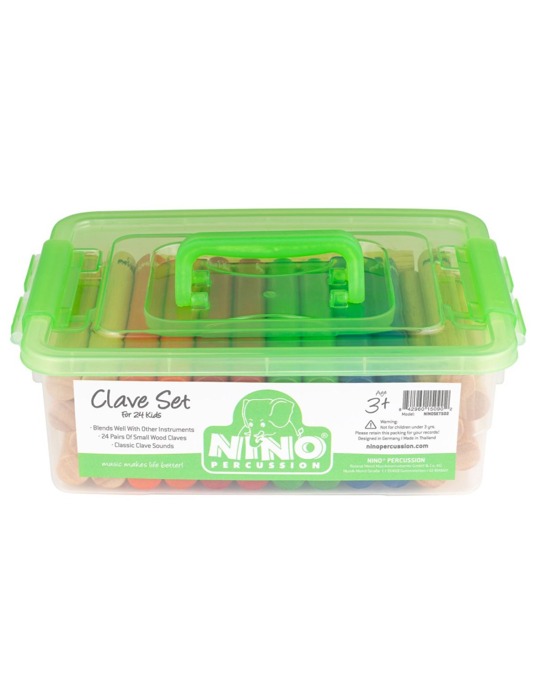 NINO¨ Percussion wooden clubs are exceptional percussion instruments with their sharp, resonant tones and ease of use. These clubs are an essential percussion instrument in any classroom musical environment. This multicolored pack contains 24 pairs of clubs for group collaboration. Suitable for 24 children. Includes: 8x Wood Claves Pair, natural 4x Wood Claves Pair, green 4x Wood Claves Pair, blue 4x Wood Claves Pair, orange 4x Wood Claves Pair, red 1x Storage Container Box Dimensions: 27.5 x 20 x 9 cm 10.8Ó x 7.9Ó x 3.5Ó NINO24