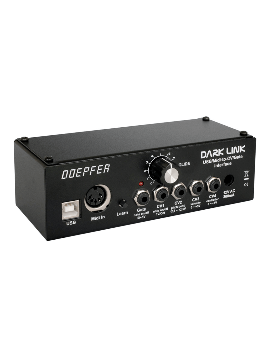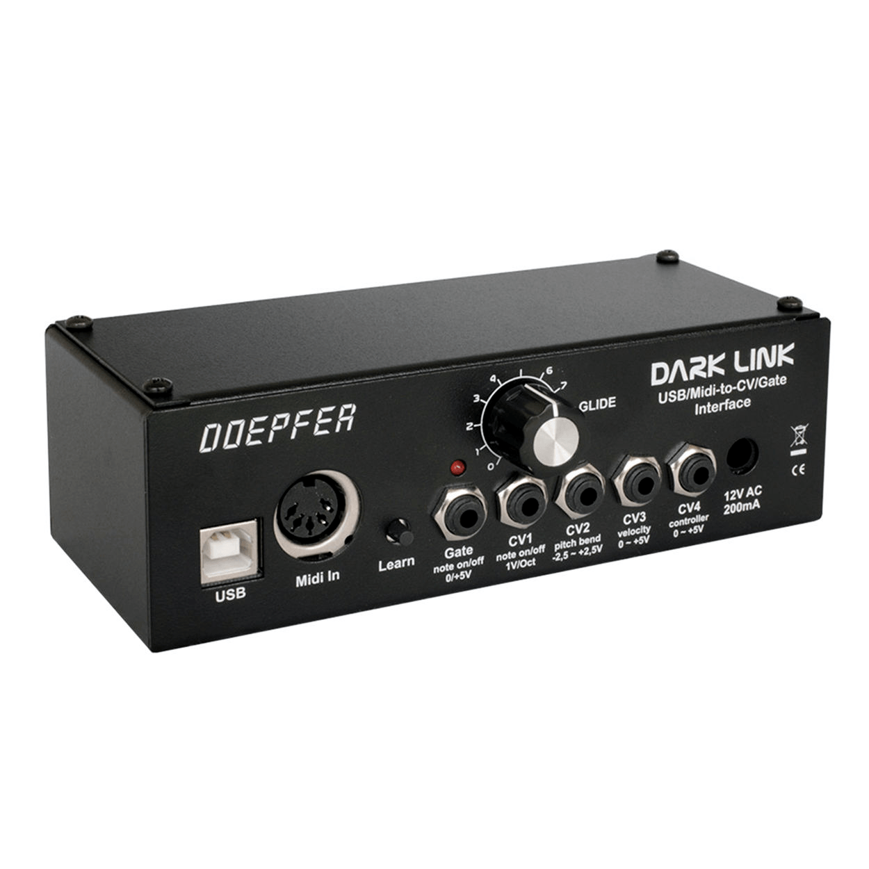 DOEPFER DARK LINK USB MIDI TO CV is a USB/MIDI-to-CV/Gate interface that can be used to control analog synthesizers via MIDI or USB. Technical features include 4 analog control outputs (CV1,2,3,4) and 1 gate signal output on a 6.3 mm jack slot, MIDI input, USB input, Learn button, encoder for glide control. It works with devices with a gate voltage of 5 V and 12 V.
