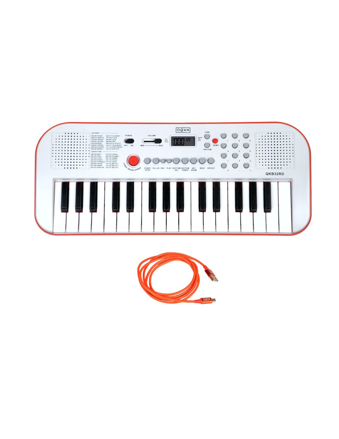 Oqan OKB32+ micro USB cable 150 cm. The Oqan QKB32 keyboards are the ideal gift for the little ones in the house, ready to enter the fantastic world of music. Available in 2 colors - white/red and white/blue - their attractive and fun design and complete features, offer infinite musical possibilities with easy and intuitive management. 32 Mini Keys, 128 Voices/128 Styles, 30 Demo Songs, Metronome, Vibrato/Sustain Functions, Keyboard Percussion, Recording/Playback Functions, Battery Power (6 x AA - not included) or through the integrated micro USB port. DC power input (not included), Headphone Output, Dimensions: 470 x 200 x 51 (mm).