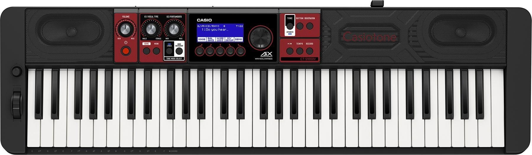 The CT-S1000V is a portable keyboard from Casio, with 61 keys. It is equipped with speech synthesis with personalized texts through the dedicated free app and rhythmic accompaniment, backlit LCD display, pitch bend wheel and knobs for controlling modulation, effects, filters