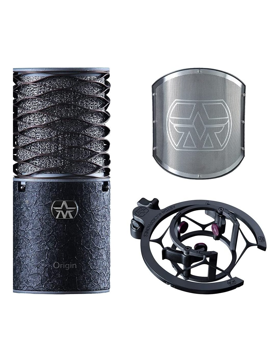 ASTON ORIGIN BLACK BUNDLE is a kit that includes the ASTON ORIGIN condenser microphone, shockmount and pop filter. ASTON ORIGIN is a condenser microphone with a large diaphragm and cardioid polar pattern, suitable for studio use and recording of voices and instruments, with a 1-inch gold-plated capsule for vaporization, 80 Hz switchable Low Cut filter, integrated antipop, shockmount integrated with the capsule, attenuation pad 0, -10dB, transformerless