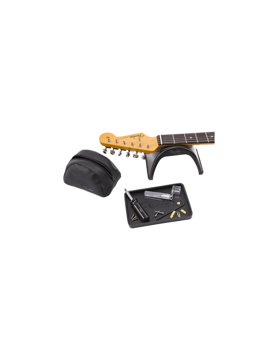 FENDER THE ARCH GUITAR WORK STATION is a neck support for maintaining guitars and basses made of nitro-safe TPE rubber with non-slip feet, rubber base and eco-leather case with space for accessories such as pliers, string winders, string cutters and adjustment keys.