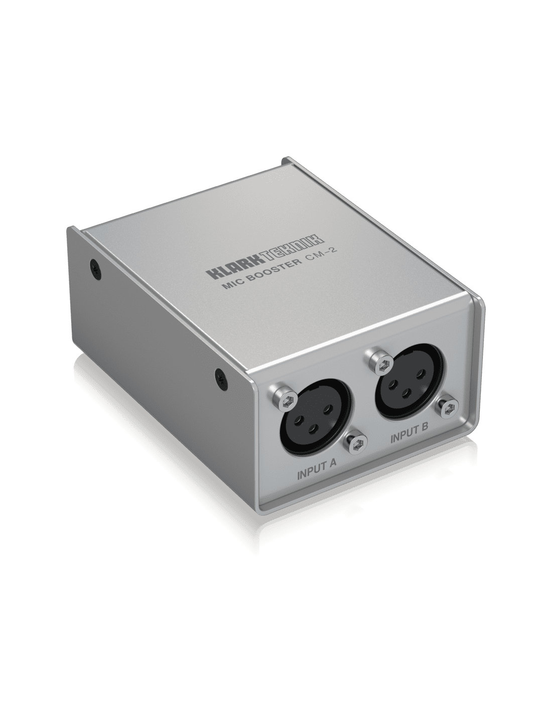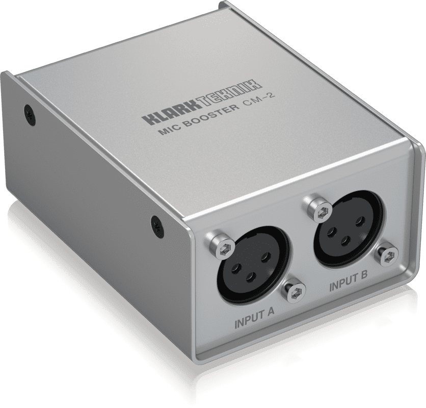 Klark Teknik Mic Booster CM-2 is a 2-channel dynamic microphone booster equipped with a high-quality preamplifier that provides up to +25 dB of gain. It can operate on phantom power, without the need for external power, and with almost any dynamic or passive ribbon microphone
