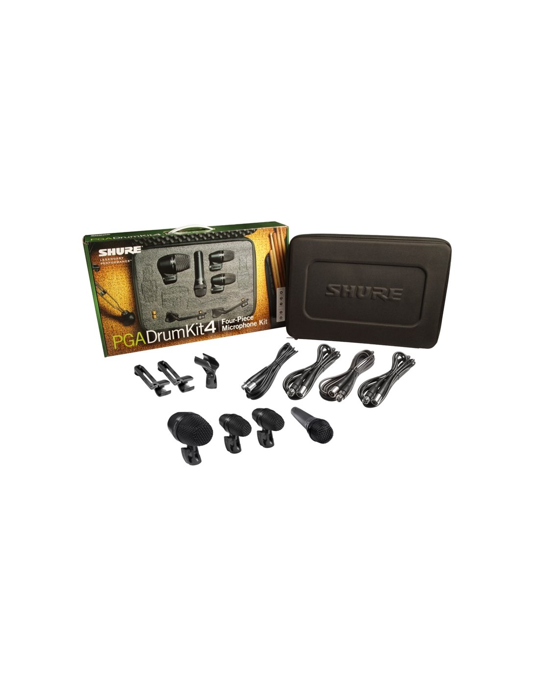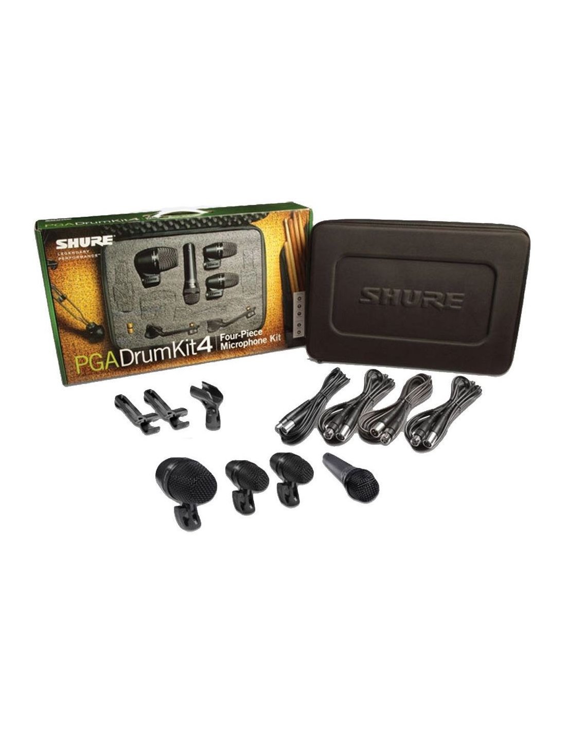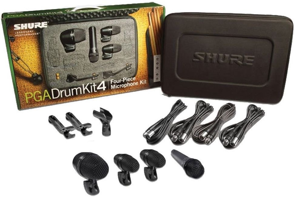 SHURE PGA DRUM KIT 4 is a briefcase set with 4 microphones for microphoning SHURE PGA series drum kits, for live and studio applications. The set includes the following microphones: 1 large diaphragm PGA52 bass drum microphone with dynamic capsule and cardioid polar pattern with optimized frequency response on bass, 2 PGA56 microphones for microphoning snares and toms with cardioid dynamic capsule, and 1 PGA57 microphone for instruments with cardioid dynamic capsule. The set includes 2 supports for mounting on a tom, 4 XLR-XLR cables and a hard carrying case