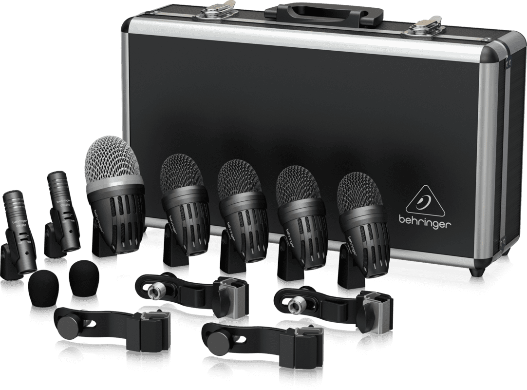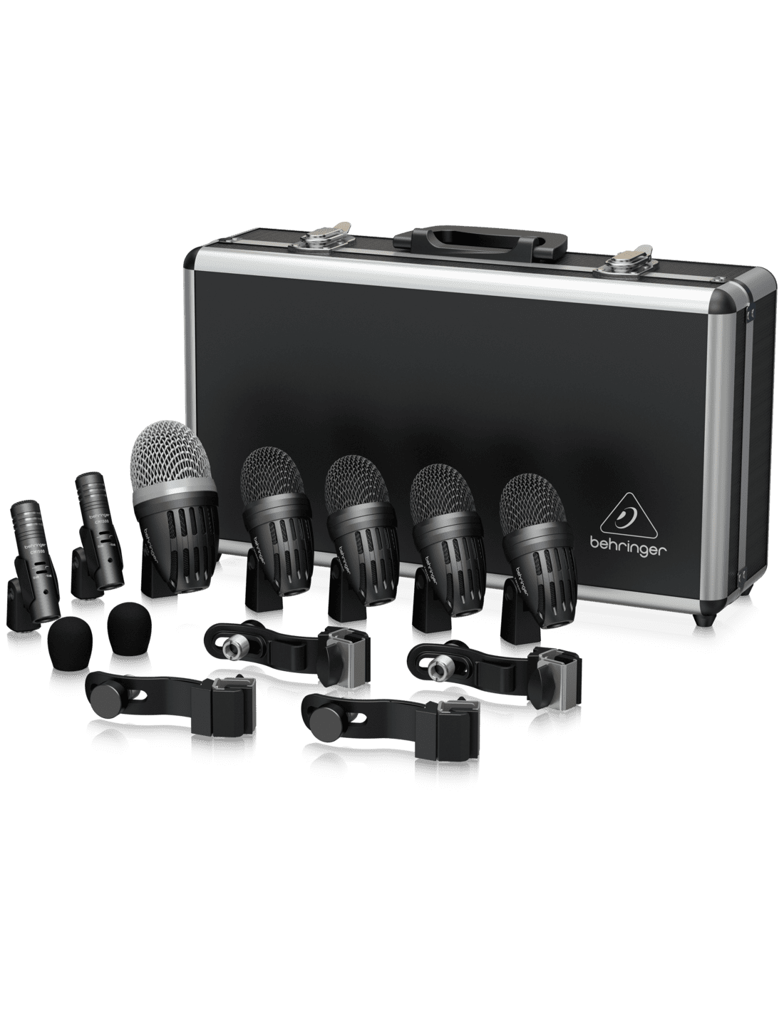BEHRINGER BC1500 is a briefcase set with 7 microphones for microphone complete with drum kit, for live and studio applications. The set includes the following microphones: 1 large diaphragm C112 bass drum microphone with dynamic capsule, 4 medium diaphragm TM1500 microphones with dynamic capsules for snare and tom microphones, 2 matched stereo CM1200 condenser microphones with narrow diaphragm and unidirectional polar pattern suitable for overhead use. Each microphone is equipped with gold-plated 3-pin XLR connectors. In addition, the set includes microphone clamps, 5/8” threaded adapters and wind