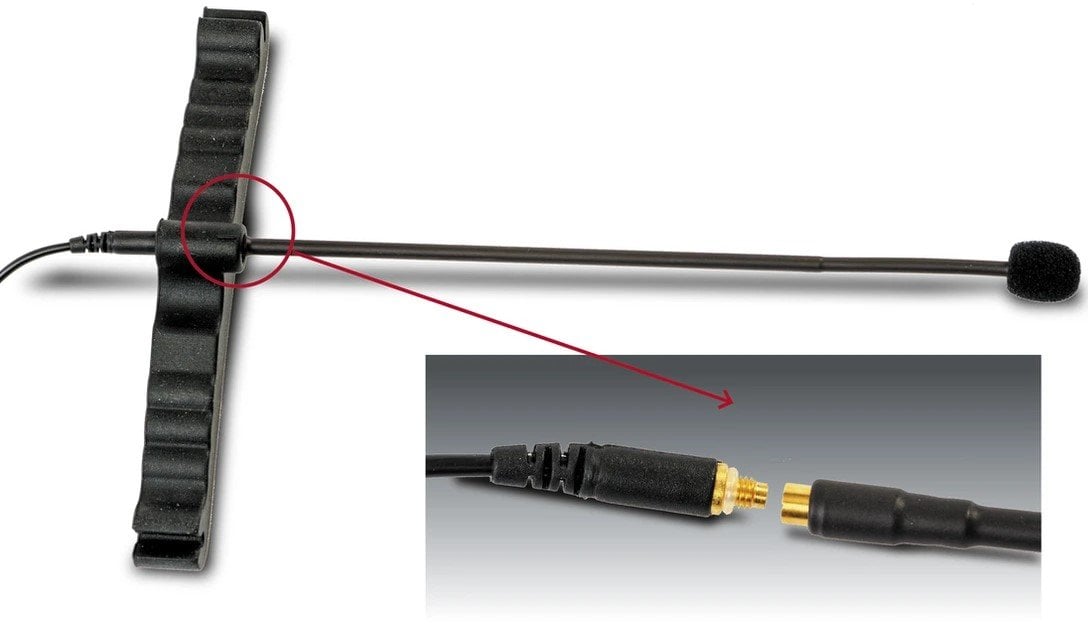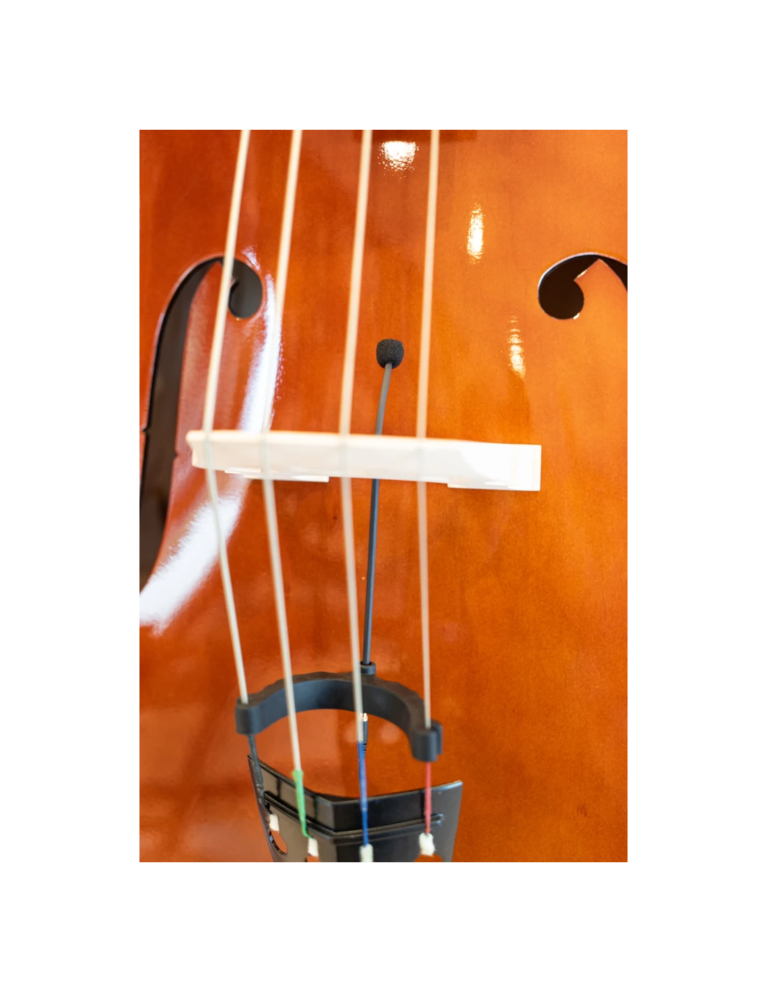 AUDIODESIGN PA MCB MICROPHONE FOR ACOUSTIC BASS. Double bass headband microphone with anti-vibration soft rubber mounting bracket, flexible and adjustable 160mm neck, type A microphone capsule with omnidirectional polar pattern. Includes 3m cable, mini XLR/XLR adapter