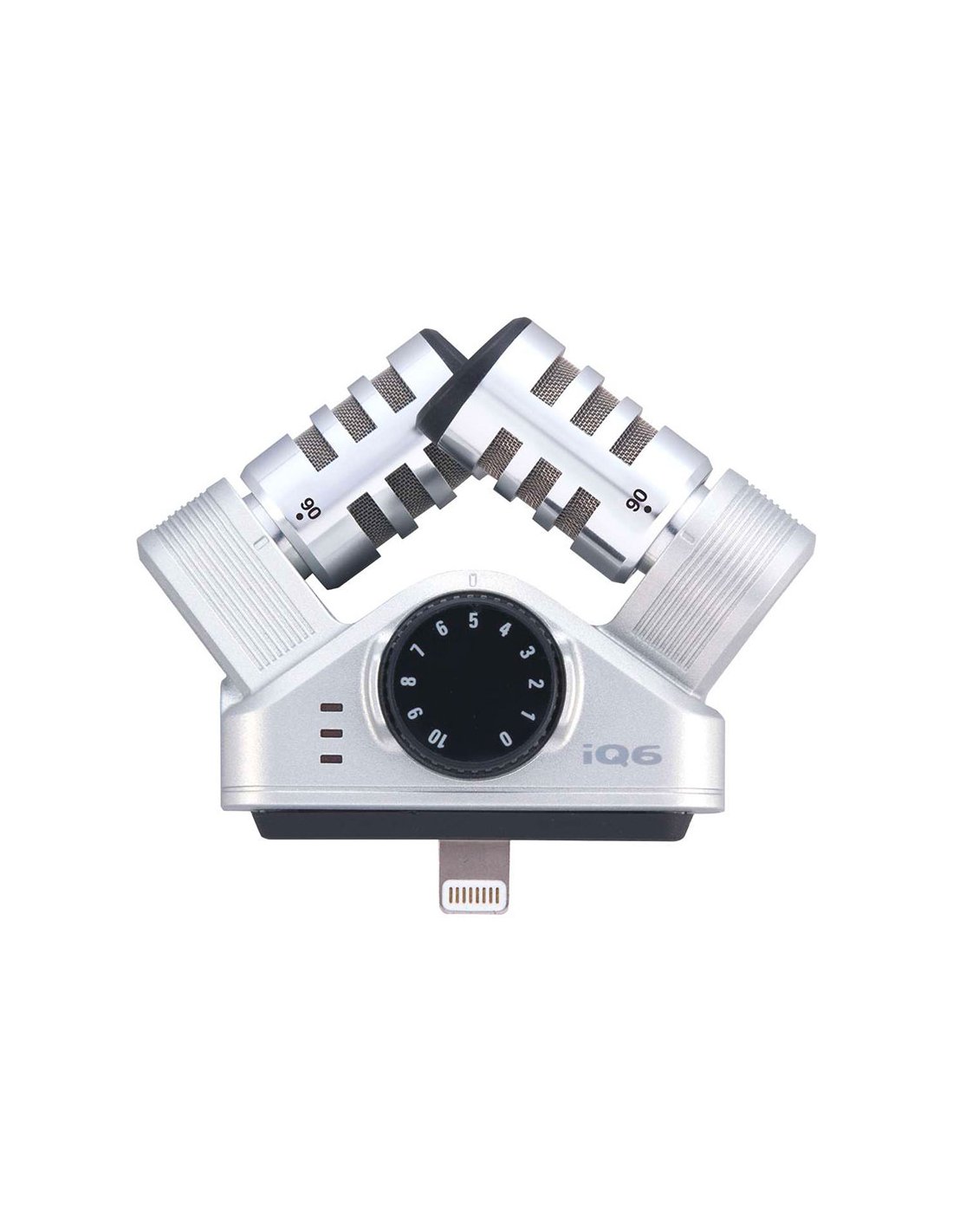 ZOOM Iq6 is a stereo X/Y condenser microphone (90°, 120°) with Lightning connector suitable for use with iOS devices. Technical features include, 16bit/44.1-48kHz audio resolution, max 130dB SPL, analog gain control, LED power indicator, Lightning connection, Handy Recorder app downloadable free of charge from the Apple Store for remote control. Compatible with iOS 6.0 and later operating systems.