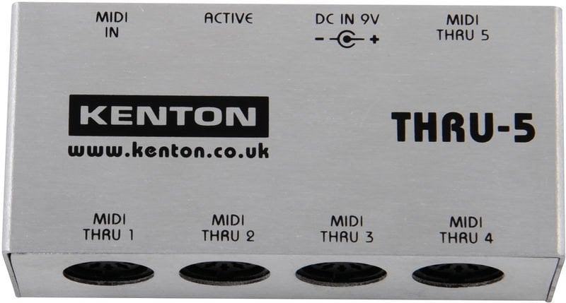 The Kenton Thru 5 is a MIDI box equipped with 1 MIDI IN and 5 MIDI OUT; all MIDI signals are sent from the input all the outputs that can be connected to any other device that needs the desired MIDI signals.
