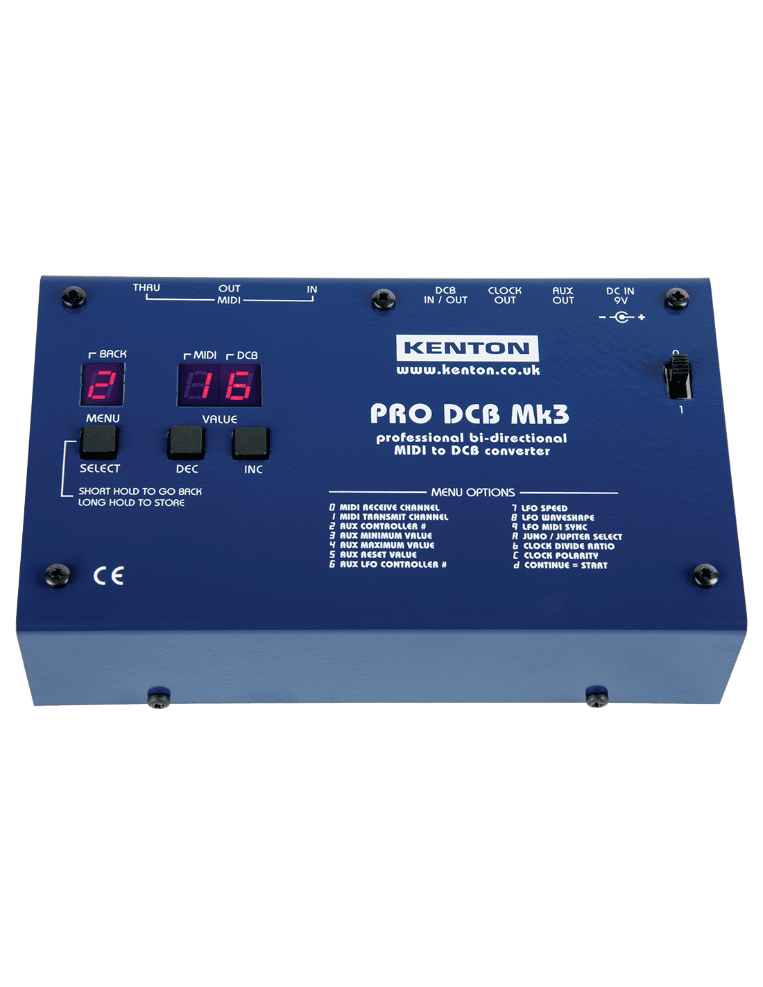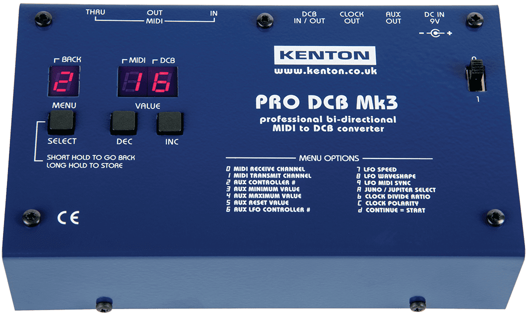 KENTON PRO TO DCB MK3 CONVERTER. Programmable MIDI converter for Roland Juno-60 and Jupiter-8 synthesizers. It controls the notes on both synthesizers and allows program changes on Jupiter-8. It has separate outputs for VCF/VCA controls and arpeggio clocking and a programmable bidirectional LFO filter