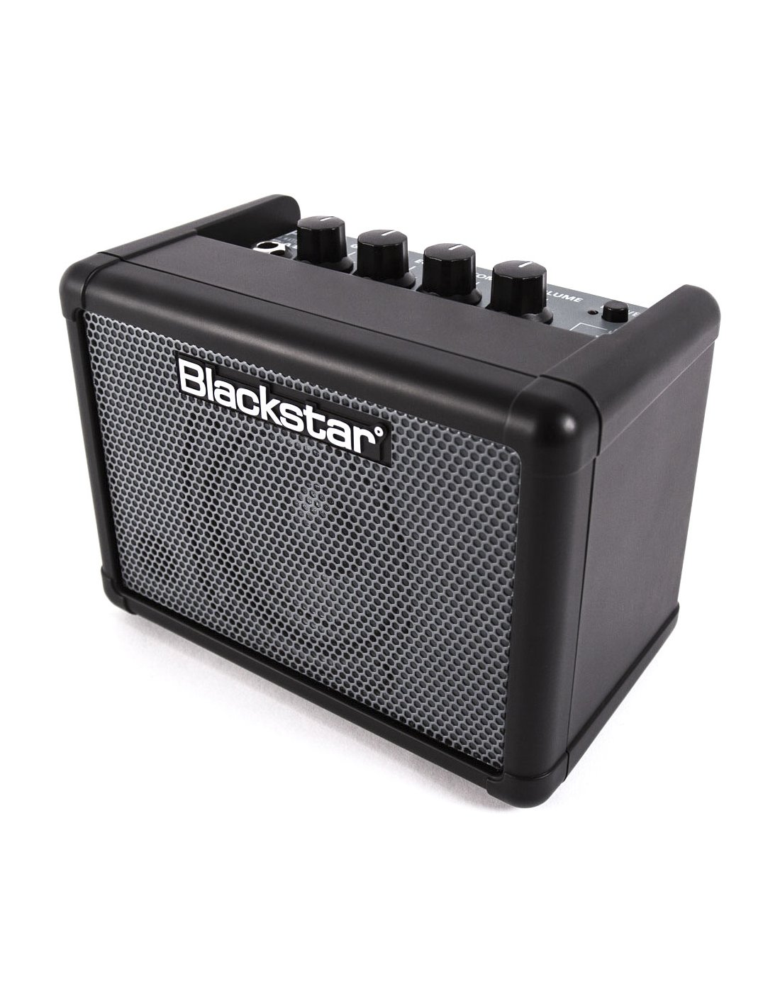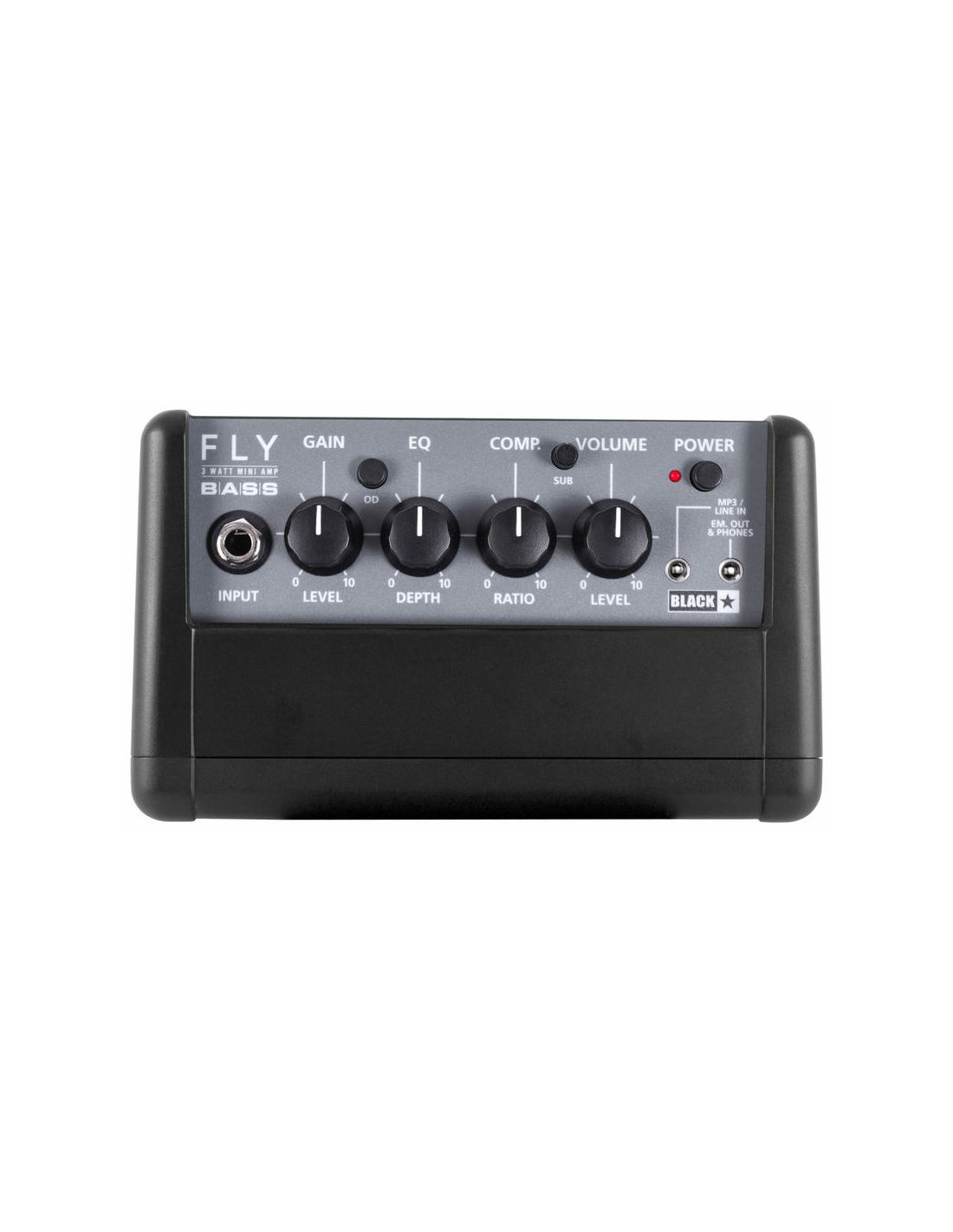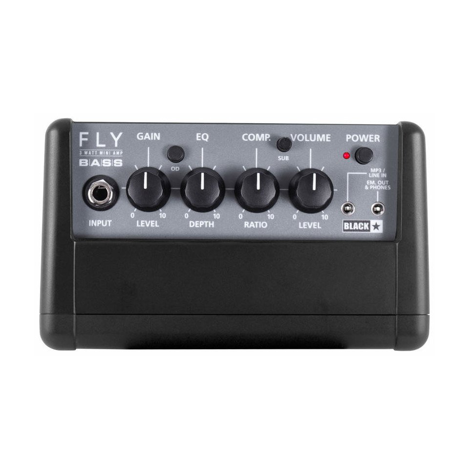 Blackstar Fly 3 Bass Electric Bass Amplifier. The Blackstar Fly 3 Bass is a 3-watt electric bass amplifier. It has 2 channels (Clean, Overdrive), Gain/Level controls, OD Switch, Comp/Ratio, Sub, Volume/Level, MP3/Line In input, Speaker Emulated Output and headphone output, 1 3-inch speaker. Battery powered or DC power supply.