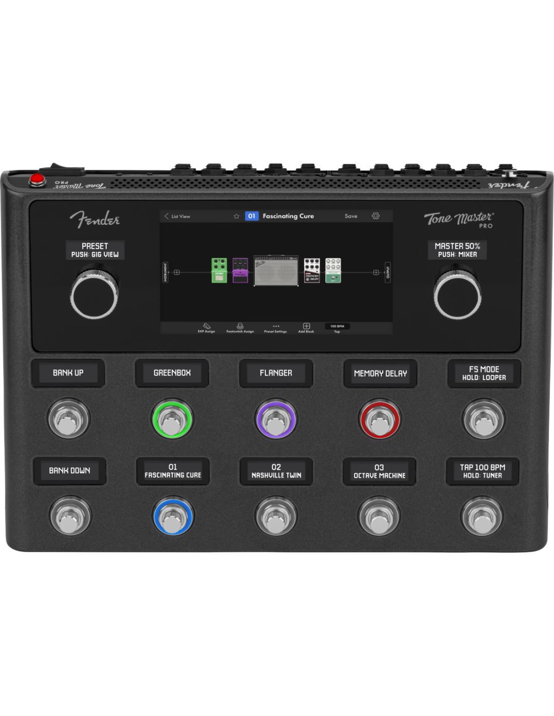 FENDER TONE MASTER PRO. Multi-effects processor and guitar workstation equipped with more than 100 amplifiers and effects, including all classic Tone Master Fender models and the officially licensed EVH 5150 III Stealth model. Technical features include 7" color LCD touchscreen display with Navigation control and preset editing functionality, 10 footswitches with backlit Scribble Strips and effect control knobs, + 6000 presets and combinations of speakers, amplifiers and microphones that can be controlled and editable thanks to the integrated Tone Master Control App and Stereo Looper 60sec. Equipped with micro-SD slot and USB-C port for computer connections