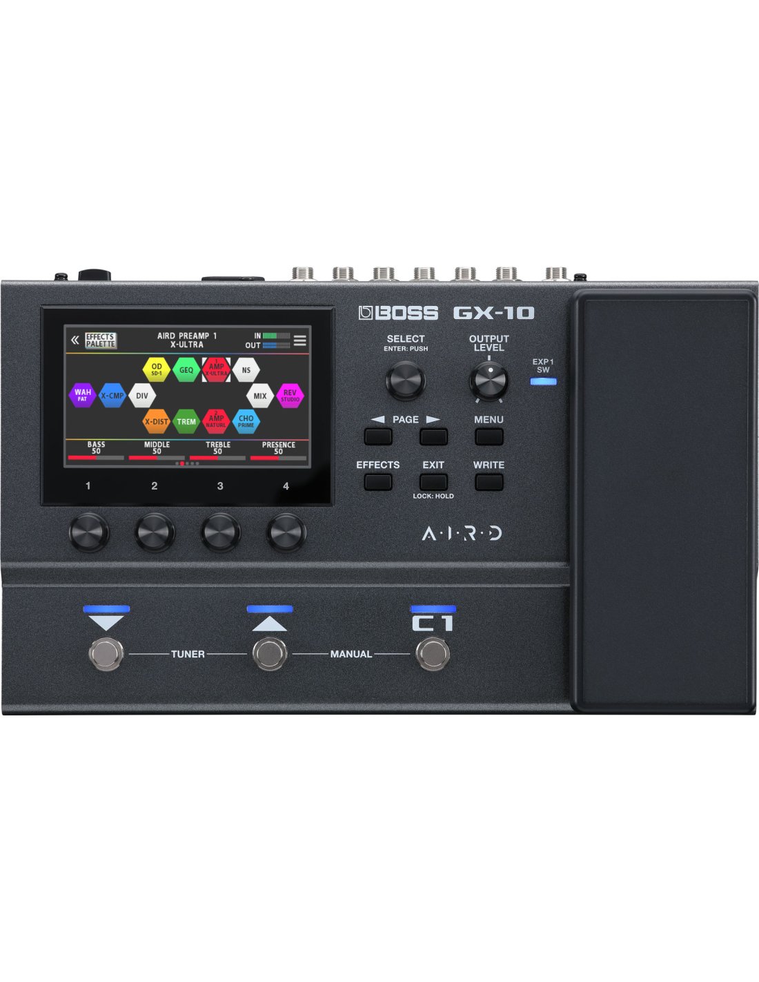 BOSS GX-10 is a compact stompbox-sized processor for guitar and bass with a color touchscreen display, multifunction foot switches and integrated expression pedal. Technical features include: wide choice of modifiable and customizable AIRD amplifiers and effects thanks to the intuitive interface and function keys/encoder, same sound generator and touch display as the GX-100 model, 24-bit AD conversion, 32-bit DA conversion, 32-bit floating point processing and 48 kHz sample rate, tube amplifier timbres and realistic touch response thanks to Boss's proprietary AIRD technology, 32 types of amplifiers and 170 BOSS effects, flexible amp routing and effects with up to 15 assignable blocks, selection of internal speakers and support for loading the IR of other speakers in WAV format, 3 footswitches with flexible control mode, integrated expression pedal with switch on the tip. It also features Loop send/return for external pedals for connecting external pedals, USB-C port for recording or playing tracks in music production software on computers or mobile devices,