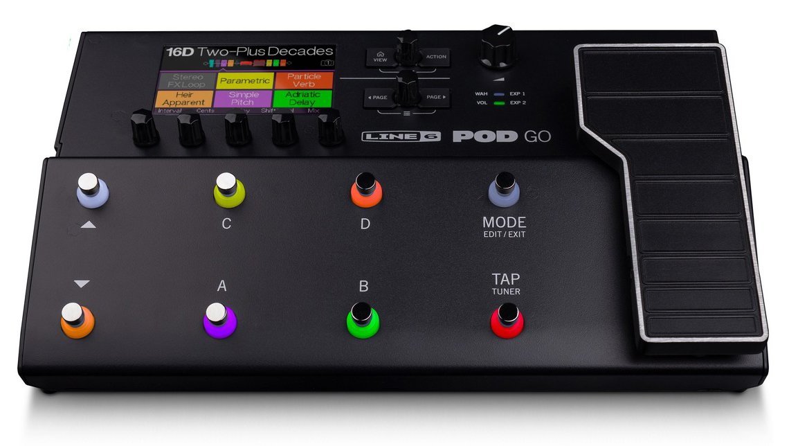 The Pod Go is a Line 6 multi-effect guitar pedalboard with modeling of amplifiers, cabinets and effects. It is equipped with an integrated expression pedal, a 4x4 USB audio interface for recordings up to 24-bit/96kHz, an FX loop, a large LCD color display and MIDI functionality for traditional switches and integration into