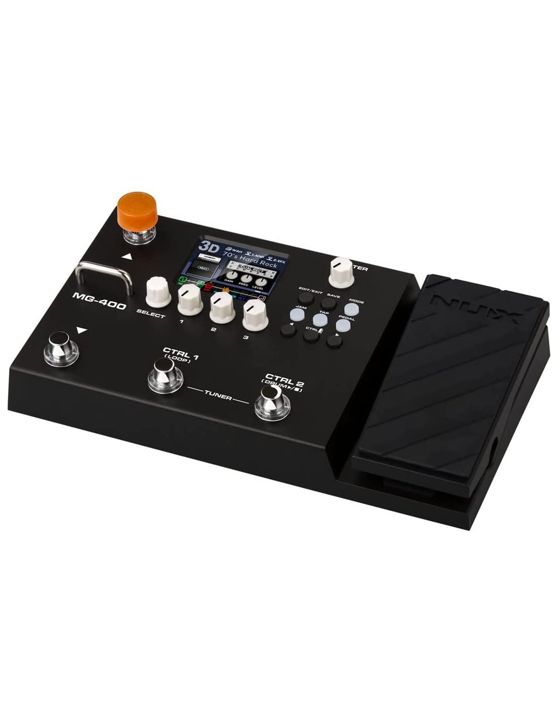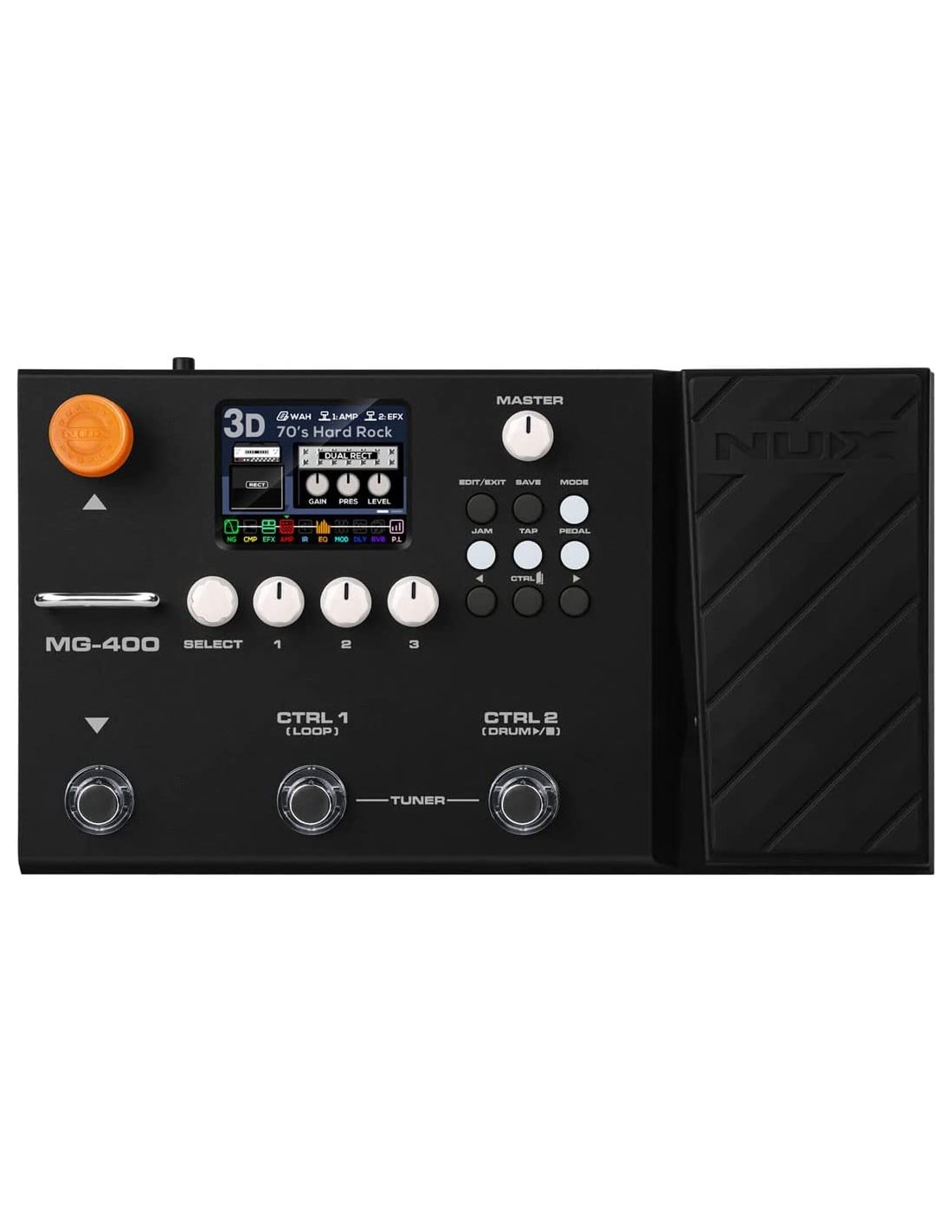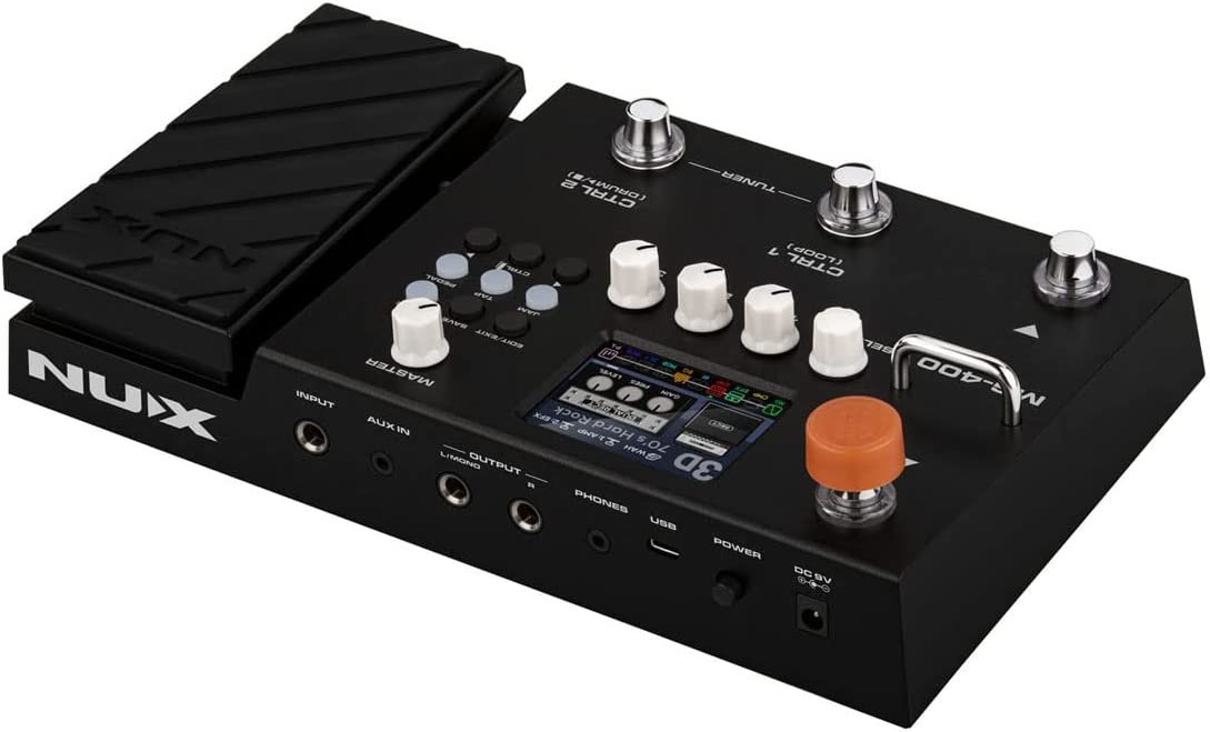 The MG-400 is a Nux multi-effect guitar pedalboard. It is equipped with modeler technology with dual NUX TSAC-HD processor that replicates the playability of a real tube amplifier, large 2.8” color LCD display, modulation, delay and reverb effects, USB audio interface, IR loader, drum machine, looper and integrated expression pedal.