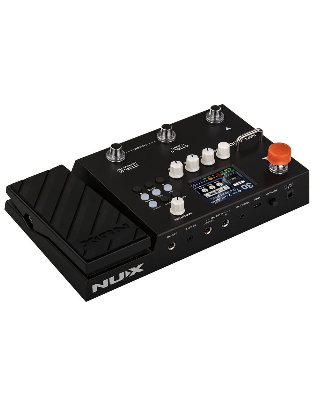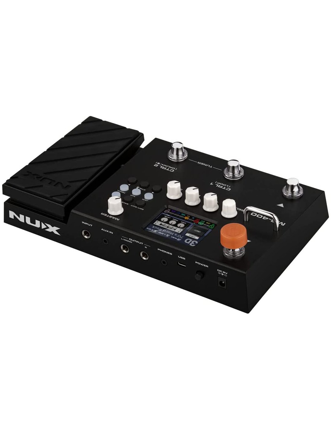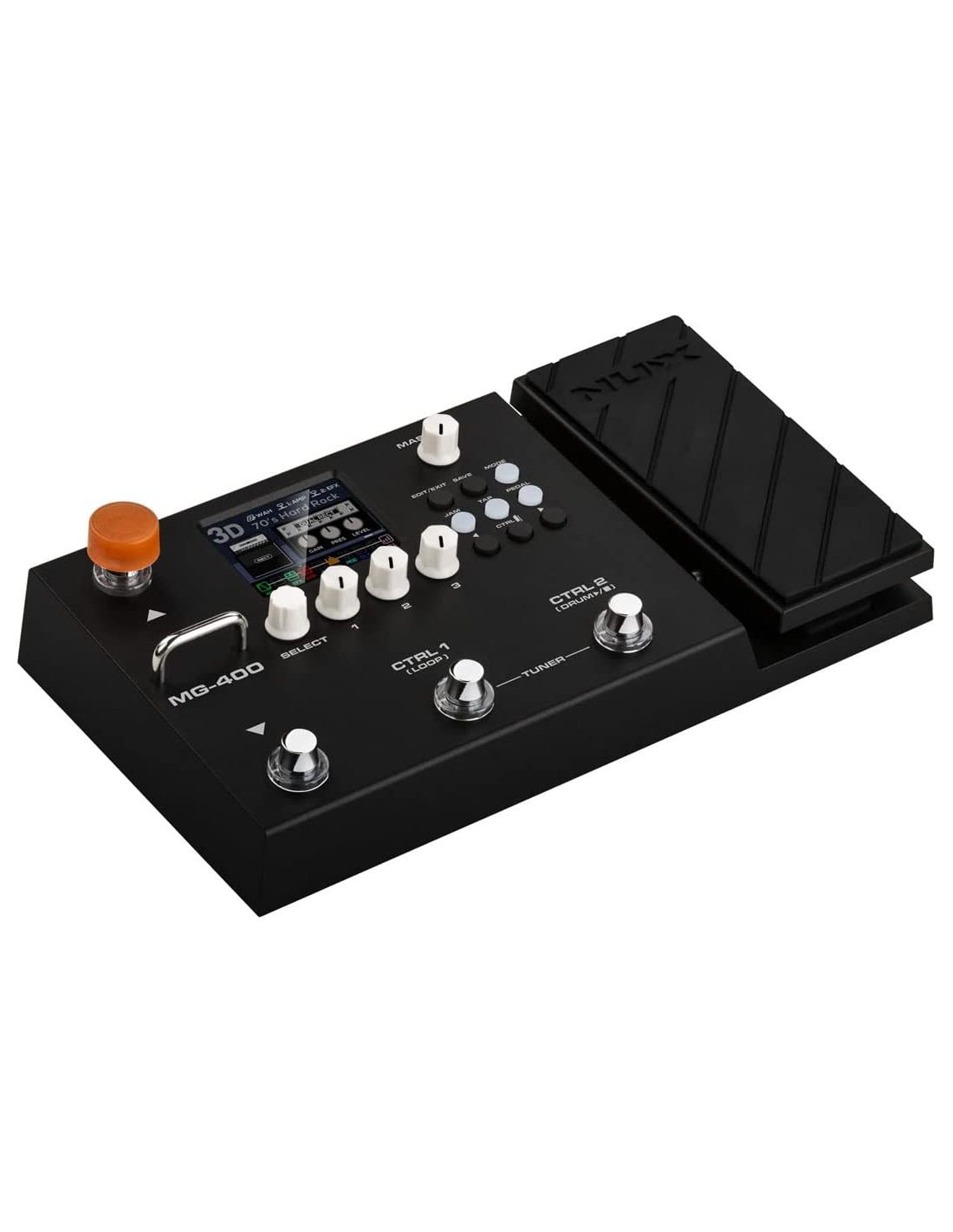 The MG-400 is a Nux multi-effect guitar pedalboard. It is equipped with modeler technology with dual NUX TSAC-HD processor that replicates the playability of a real tube amplifier, large 2.8” color LCD display, modulation, delay and reverb effects, USB audio interface, IR loader, drum machine, looper and integrated expression pedal.
