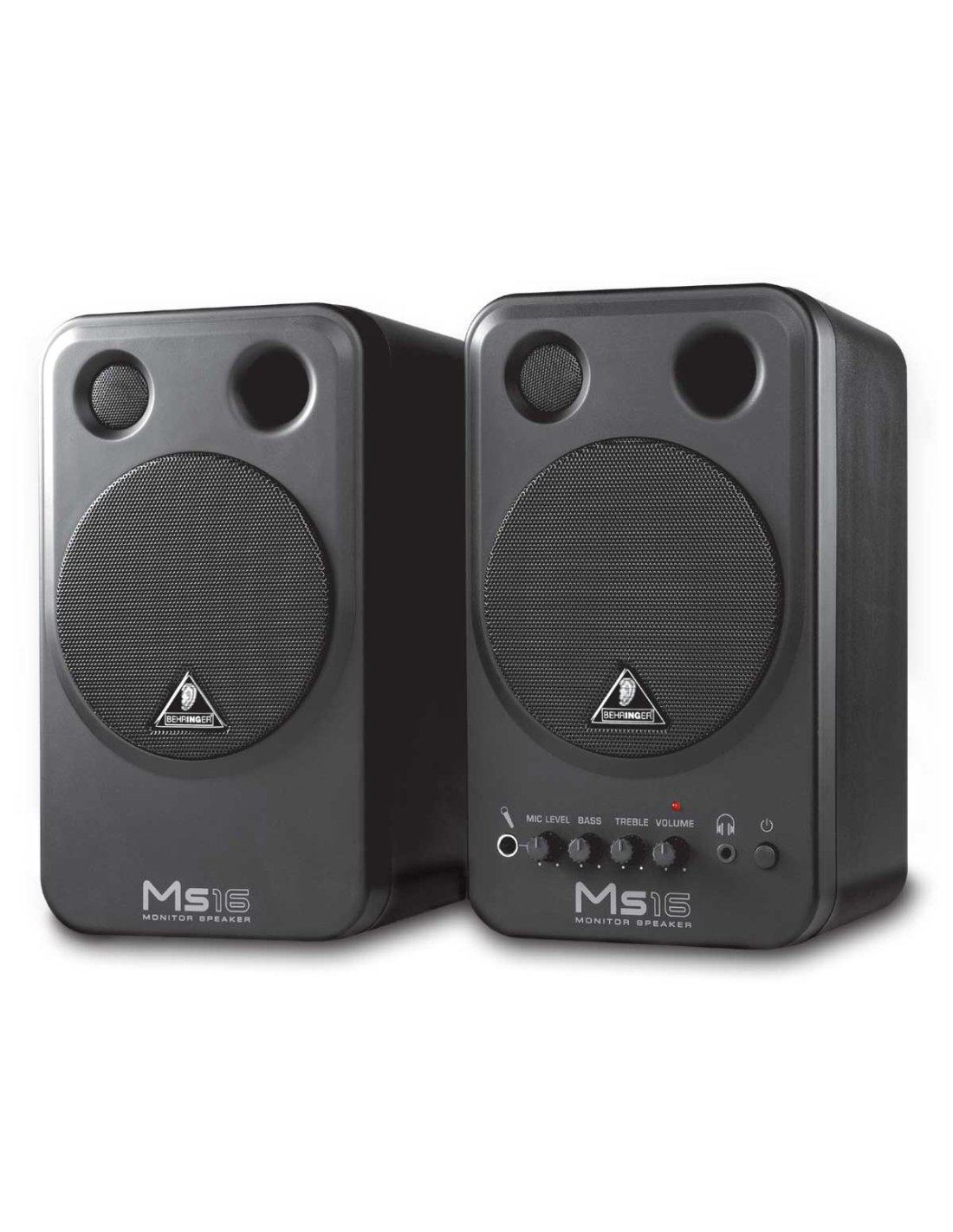 The MS16 Pair is a pair of Behringer 2-way active studio monitors. They are equipped with two 8W amplifiers, 4" woofers, 1.5" tweeters, two RCA line inputs and 1/8" jack, a 1/4" microphone input, a 1/8" headphone jack, volume control controls and separate treble and bass controls