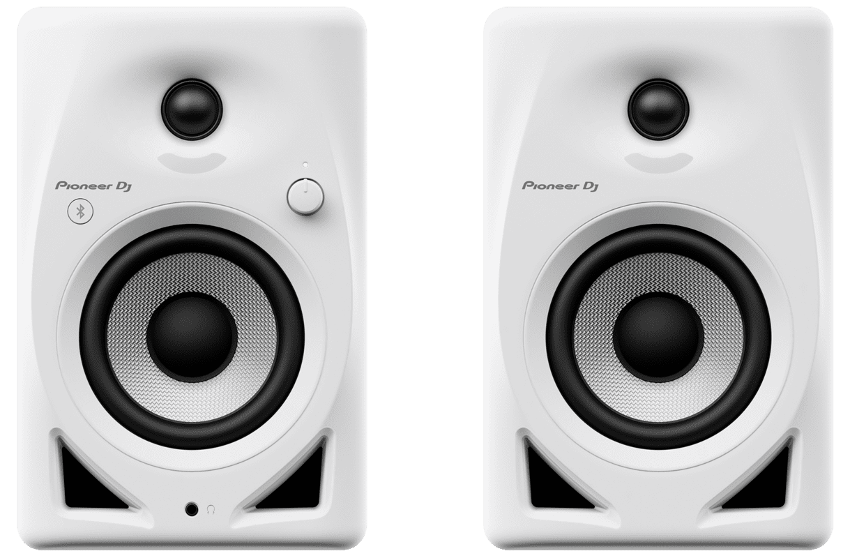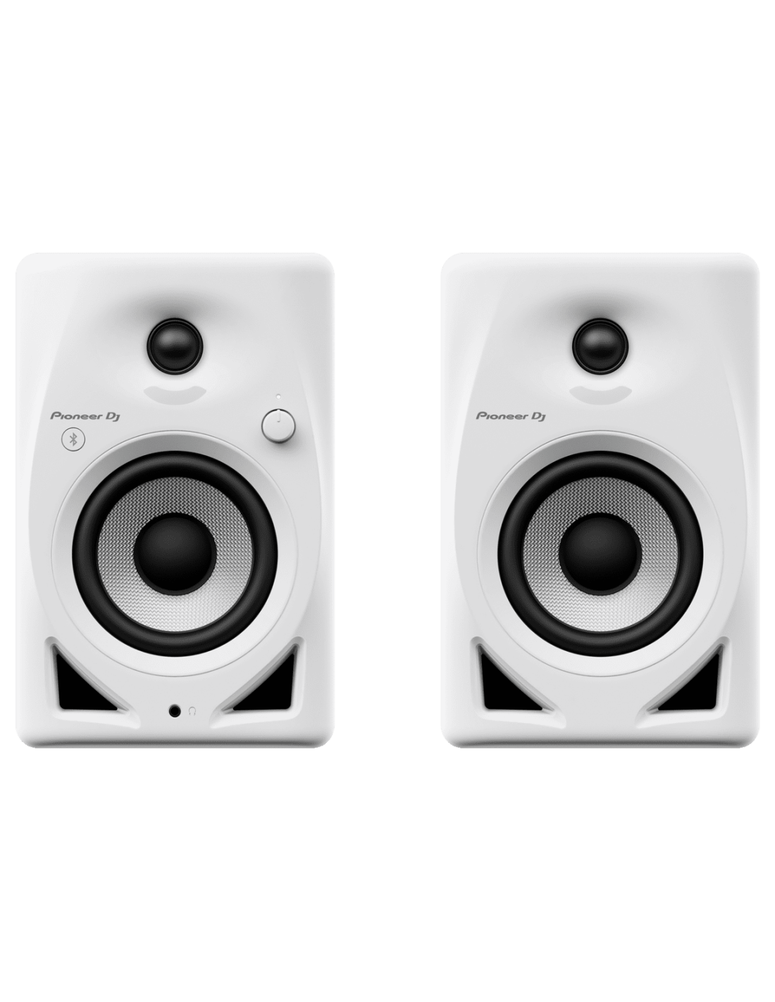 PIONEER DJ DM-40D-BT WHITE PAIR. Pair of Bluetooth studio monitors with 4" speakers and 38W power. Technical features include class D amplifier with 96 kHz sampling DSP, Bluetooth version 5.0, 4" fiberglass woofer, soft dome tweeter, 3D stereo sound thanks to DECO convex speakers. On the back panel: Sound Mode Dj/Production switch, RCA Left/Right input, mini stereo input via 3.5mm jack. White color.