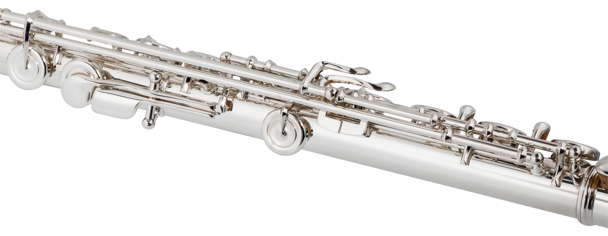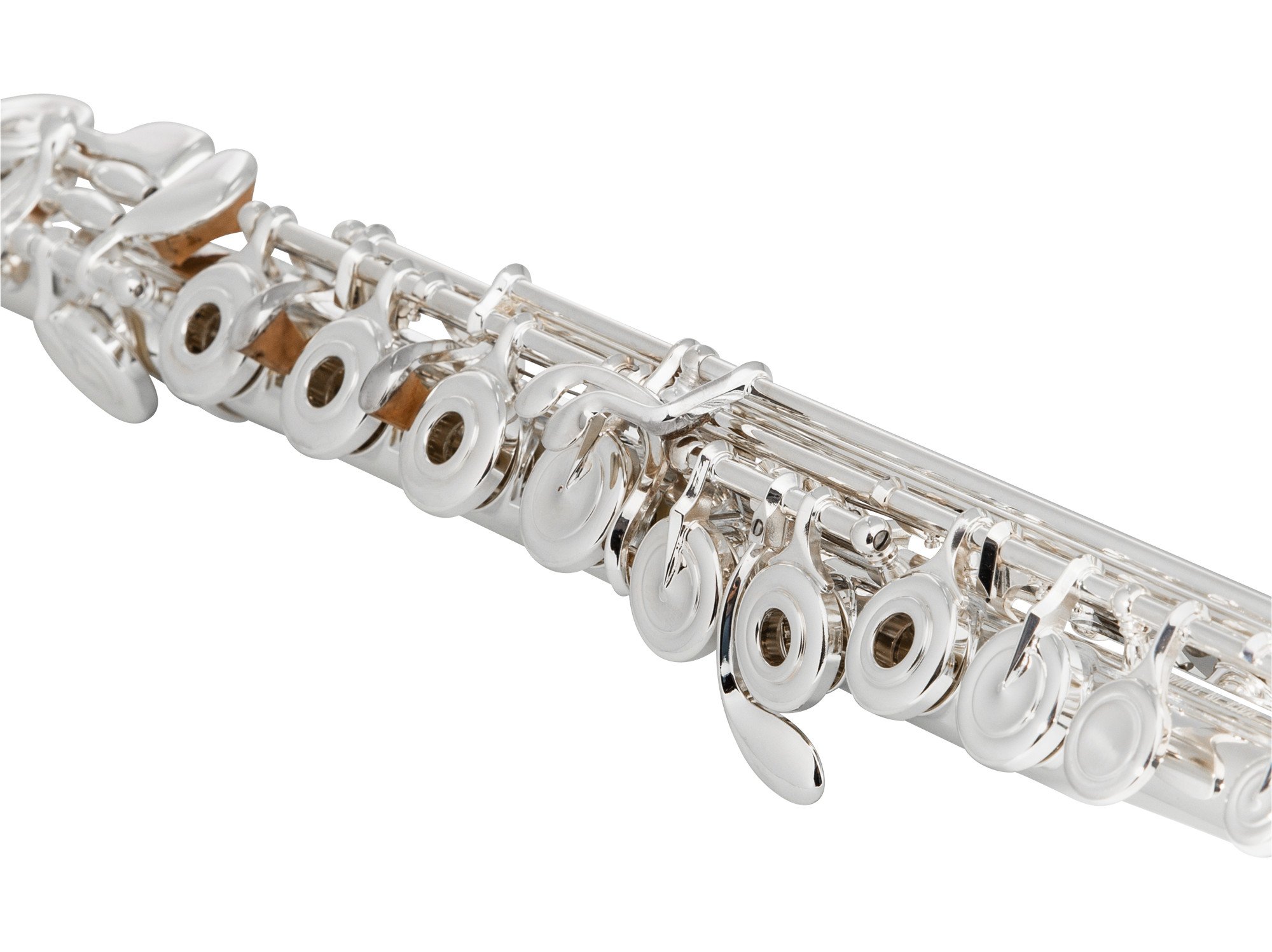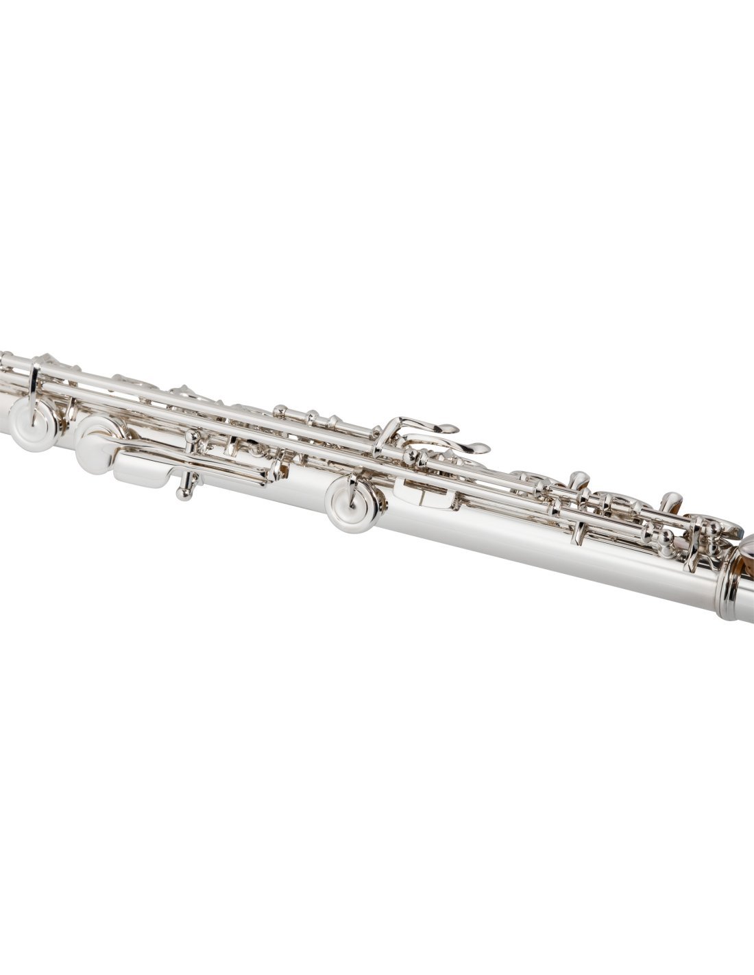 This series of silver-bodied flutes offers a smooth response, allowing players to focus perfectly on each tone. The French-style pointed armrests, a flute standard for demanding professionals, also ensure a clear and precise mechanical response. The headboard joint, the bushing, the well and the body are made of sterling silver (925). The DO# trill simplifies many difficult fingering for trill and tremolo and has become one of the favorite features of professional flutists. Headboard: handmade Z-cut, Sterling Silver (925) Bushing: Sterling Silver (925) Shaft: Sterling Silver (925) Body: Sterling Silver (925) Mechanics: Nickel Plated Silver C#-Trill Button SI Foot Open Holes French Style Pointed Armrests Staggered Sol Mechanism And Pitch: A= 442Hz Original AZUMI case and bag included