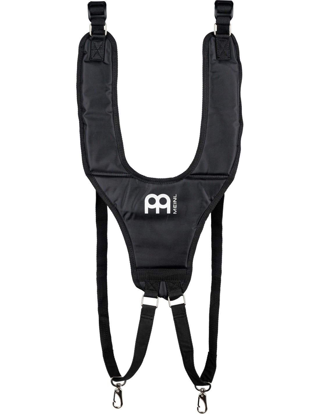'Nylon shoulder strap for black djembe. The Meinl harness is designed to comfortably and securely position any djembe or other drum in a perfect position for playing. You can adjust the length and padding of the heavy nylon straps for optimal positioning.