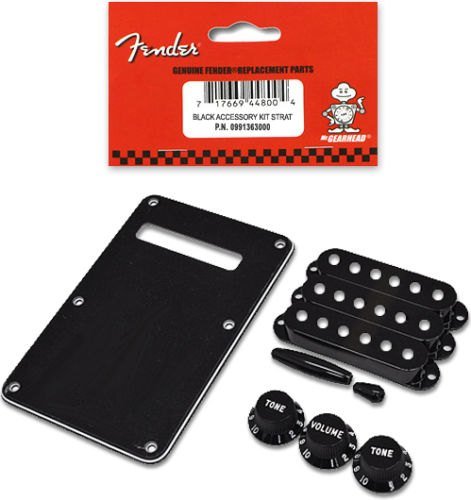 Accessory Kit for Stratocaster Fender Accessory Kit Strato Black. The Fender Accessory Kit Strato Black is a stratocaster kit that includes three pickup covers, a tremolo knob, a selector knob, a volume knob, two tone knobs, and a spring cover backplate. Color Black.