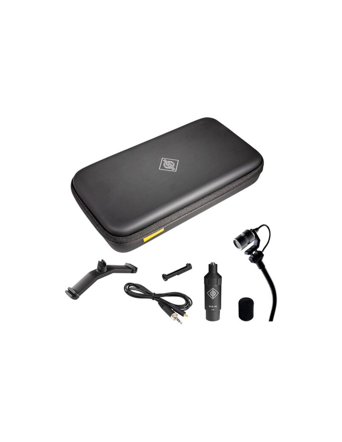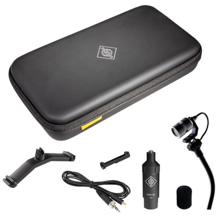 Set completo MCM 114 Set Bass include una capsula cardioide KK 14, collo d'oca flessibile da 6" e clip MC 9 per il montaggio sullo strumento. C'è anche un cavo AC 31 con connettori di bloccaggio da 3,5 mm, un windscreen WS 11, un output stage MCM 100 e una custodia che contiene il tutto.