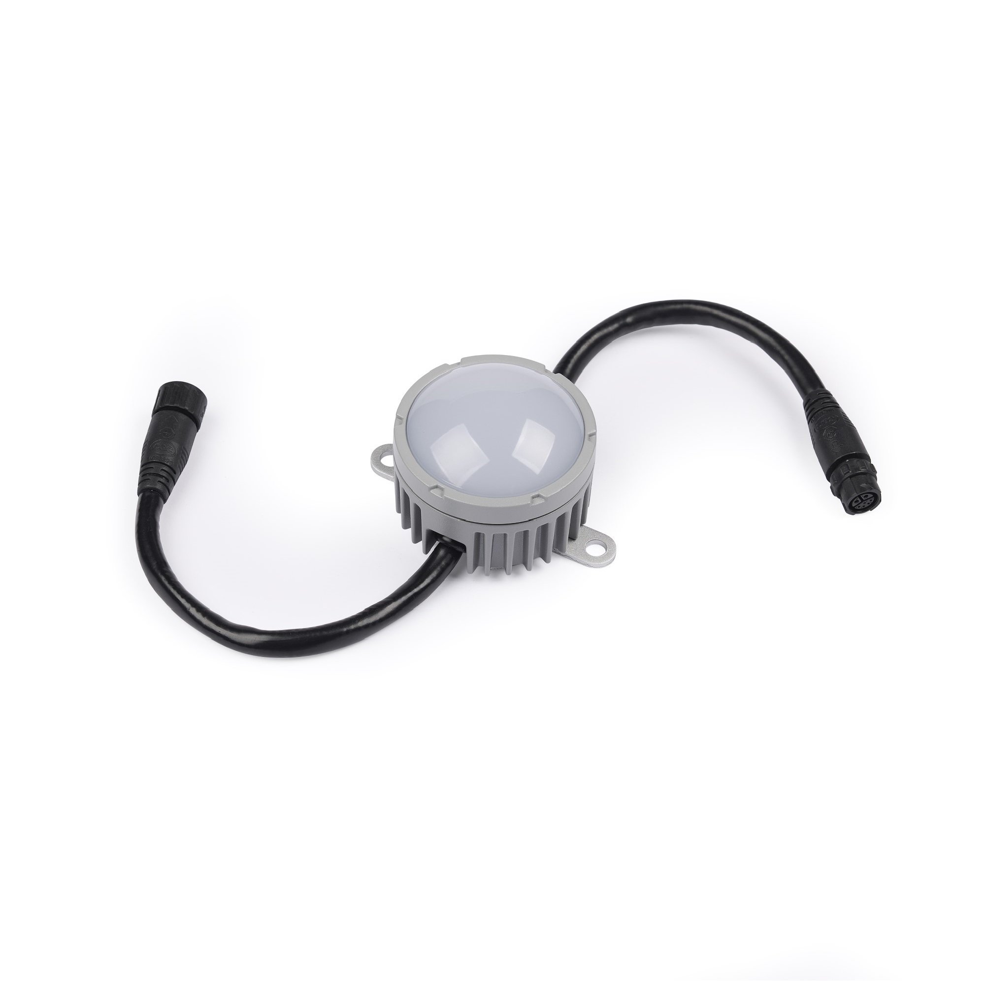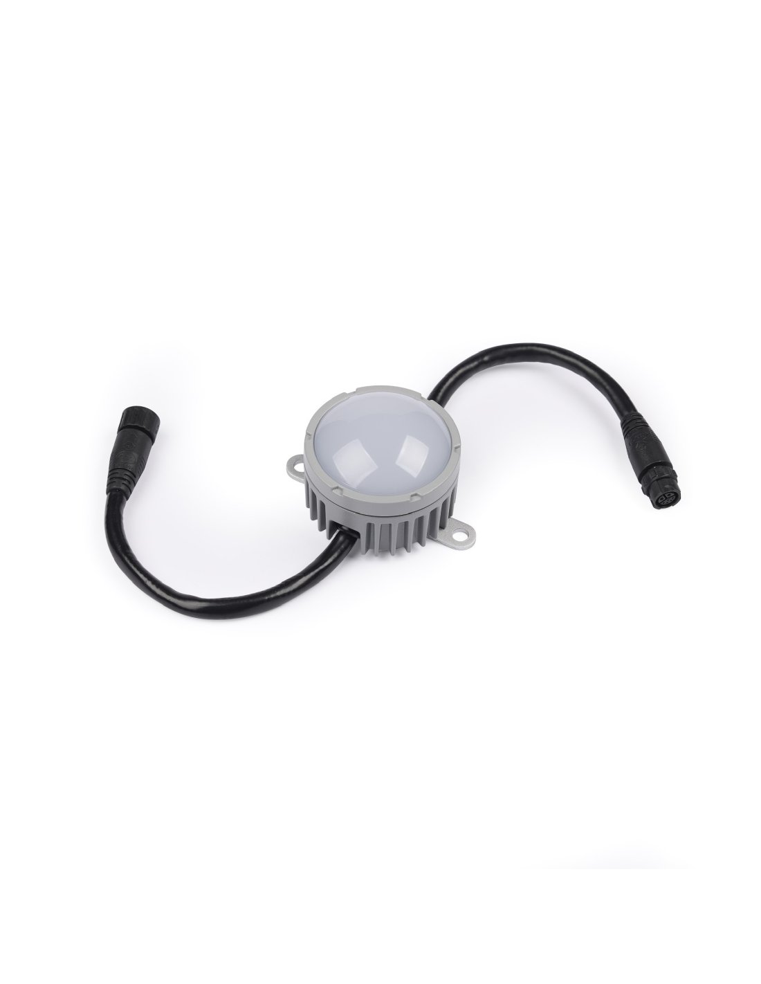 Dot a LED ad alta luminosità da esterno (luce bianca fredda, diffusore a cupola). Apertura fascio 180°. 16 RGBW LEDs. CTC 2.000-12.000K. DMX, RDM, ArtNet, sACN, P3. 6/12/4/3/48 canali. 395g. IP67.