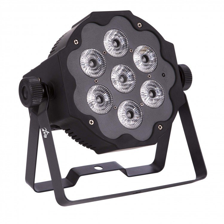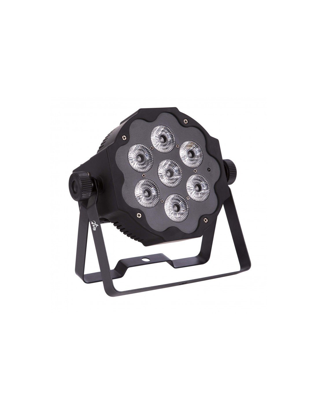 The SAGITTER BY PROEL SLIMPAR7DL 7X12W LED RGBW is a LED projector equipped with 7x 12W LONGLIFE RGBWAU FULLCOLOR LED (Red, Green, Blue, White, Amber, UV) with a 25° optic. Selectable control mode, DMX512 1/6/7/10 channels, Auto, Sound, Master/Slave. IN OUT DMX512 XLR 3PIN, IN OUT VDE (parallel