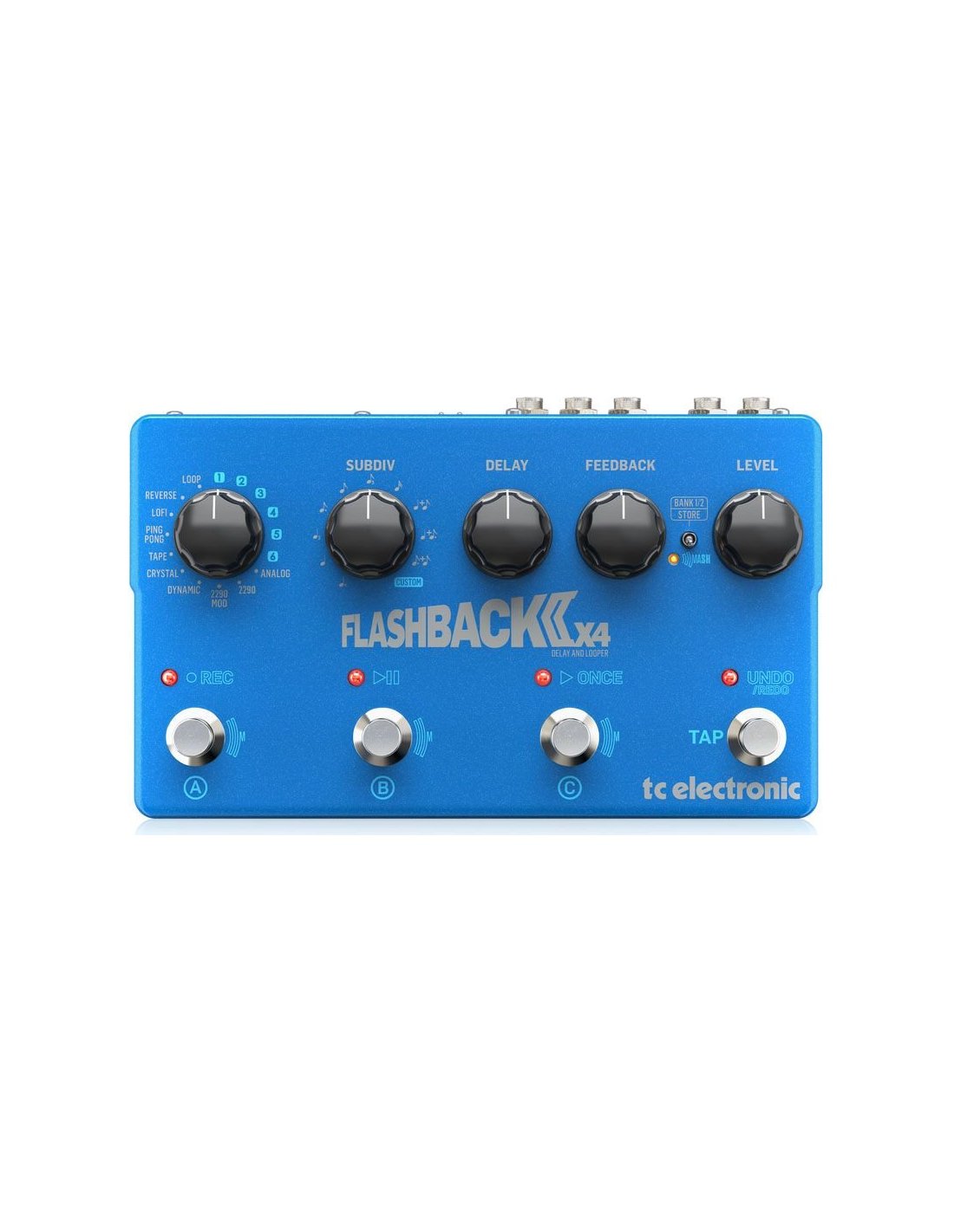 TC Electronic Flashback 2 X4 Delay & Looper Guitar Pedal. The TC Electronic Flashback 2 X4 Delay & Looper is a true bypass guitar pedal delay. It is equipped with a rotary control that allows you to select the 10 types of delays (Analog, 2290, 2290 Mod, Dynamic, Crystal, Tape, Ping Pong, LoFi, Reverse, Loop) plus 6 TonePrint slots to load new configurations designed by TC programmers and world-famous musicians or create new ones through the free TonePrint Editor application. Continuing on we have the Subdiv, Delay, Feedback, Level controls and the mini switch to select Bank 1/2 and Store. Four foot switches allow the selection of A, B, C presets, the looper control, the Tap Tempo and to activate the Mash function. It is equipped with stereo inputs and outputs, expression pedal input, USB port and MIDI In/Out connections