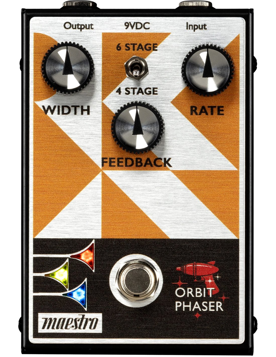 MAESTRO ORBIT PHASER is an analog Phaser guitar pedal. Technical features include 6 stage/4 stage switches to select phaser stages, Width, Feedback and Rate control to set effect intensity, signal return and reproduction speed respectively