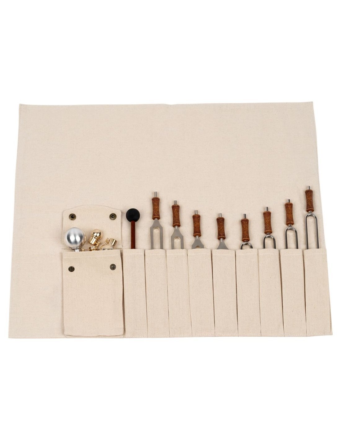 'The Meinl Sonic Energy roll-up fork bag is convenient to carry and to keep the tuning fork and accessories close at hand. Up to nine TF or TTF series tuning forks can be inserted inside the bag. In addition, a buttoned compartment can hold accessories such as gemstones, vibrating tuning fork feet, and more. The bag is easy to roll up once everything has been stowed away. For transporting and storing tuning forks, 9 keyboard compartments, 1 accessory compartment, suitable for all TF and TTF tuning forks. Dimensions 18.1" x 21.7", 46 cm x 55 cm SE2024'