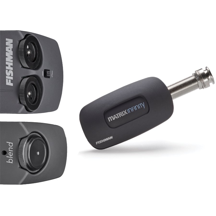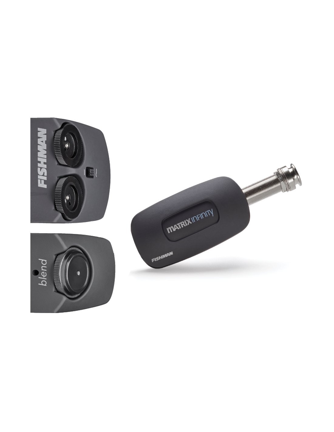 Matrix Infinity Mic Blend by Fishman, in the guitar version, is optimized to offer even better performance with modern acoustic guitar amplifiers, the Matrix Infinity Mic Blend pickup and preamp system also adds a multi-position cardioid condenser microphone capsule. The clear, transparent Fishamn-quality tone and dynamic string response have been combined with numerous new design features and performance improvements. A sealed, redesigned enclosure for the Volume and Tone control module mounted on the hole allows players to easily adjust their sound. The addition of a Blend control module on the side of the hole allows you to mix the microphone. Matrix Infinity Mic Blend presents the world's best-selling piezo pickup, Acoustic Matrix®, an endpin-mounted preamplifier in a newly designed soft touch housing, second voicing dug into the mids, integrated stereo/mono output functionality (option determined by the choice of cable). The controls maintain the same functionality in stereo mode. Integrated LED low battery indicator located on the Blend control module. Solderless connections for easy installation. Pickup available in wide, narrow, split saddle and ukulele formats. Suitable for nylon and 12 strings.