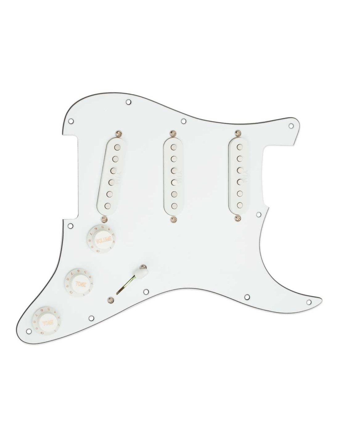11203-33-WH-PGD This fully loaded Strat pickguard was spec'd out by Yngwie himself to ensure that with this setup your Strat will deliver The Fury. The YJM Fury Loaded strat pickguard is ready to drop-in to your Stratocaster with an 11 screw-hole USA pattern. This prewired setup includes a calibrated set of the YJM Fury signature pickups, and the high-speed no-lube YJM volume potentiometer that meets Yngwie's demands for speed and responsiveness. These handmade pickups are built and loaded into the pickguards in Santa Barbara, CA. The bridge model is designed to handle Yngwie's chordal onslaught, and it delivers a precise, articulated response that has just the right amount of high end without sounding harsh or brittle. The bridge model is wound hotter to provide better balance with the neck & middle pickups. The neck and middle model is designed to bring out the balance of Yngwie's fluid left-hand technique with his broad mix of right-hand pick attack for a tone that is sweet and smooth. There is just the right amount of high end to make this pickup extremely articulate, and especially responsive to dynamics. Back in the 80s we patented a special bottom coil that actually injects negative hum into the pickup circuit and at the end of the production process, and we fine tune each pickup for maximum noise cancellation. You get all of the great qualities a classic Strat pickup, and none of the hum with our Stack pickups.
