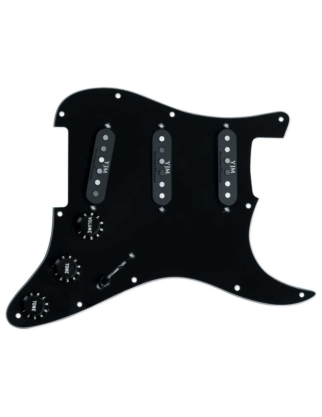 11203-33-BK-PGD This fully loaded Strat pickguard was spec'd out by Yngwie himself to ensure that with this setup your Strat will deliver The Fury. The YJM Fury Loaded strat pickguard is ready to drop-in to your Stratocaster with an 11 screw-hole USA pattern. This prewired setup includes a calibrated set of the YJM Fury signature pickups, and the high-speed no-lube YJM volume potentiometer that meets Yngwie's demands for speed and responsiveness. These handmade pickups are built and loaded into the pickguards in Santa Barbara, CA. The bridge model is designed to handle Yngwie's chordal onslaught, and it delivers a precise, articulated response that has just the right amount of high end without sounding harsh or brittle. The bridge model is wound hotter to provide better balance with the neck & middle pickups. The neck and middle model is designed to bring out the balance of Yngwie's fluid left-hand technique with his broad mix of right-hand pick attack for a tone that is sweet and smooth. There is just the right amount of high end to make this pickup extremely articulate, and especially responsive to dynamics. Back in the 80s we patented a special bottom coil that actually injects negative hum into the pickup circuit and at the end of the production process, and we fine tune each pickup for maximum noise cancellation. You get all of the great qualities a classic Strat pickup, and none of the hum with our Stack pickups.
