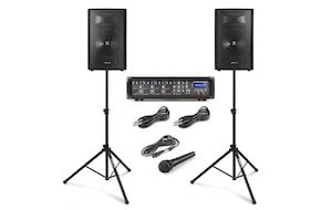 The VX210 is a complete PA audio system equipped with a 4-channel mixer with amplifier and media player, two 10-inch full-range speakers, and all other necessary accessories. The system also includes a wired microphone and two speaker stands that make it a complete plug and play system. The 4-channel mixer with amplifier and BT adapts to a number of different applications, such as Live PA, DJs, musicians, bands and other PA purposes. Each input channel has a separate bass and treble control, as well as an individual level control per channel. The built-in echo effect generator has adjustable time and repetition options, and the level can be set individually for each channel. The unit is built in a sturdy and sturdy case that will protect the mixer both on stage and during transport.