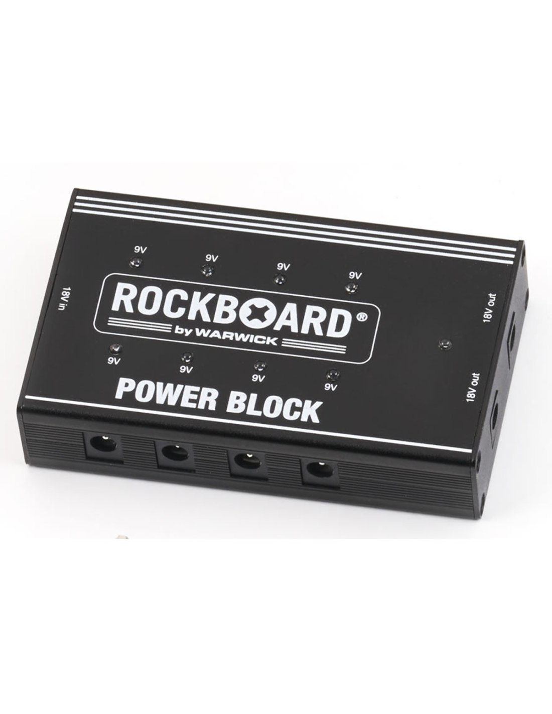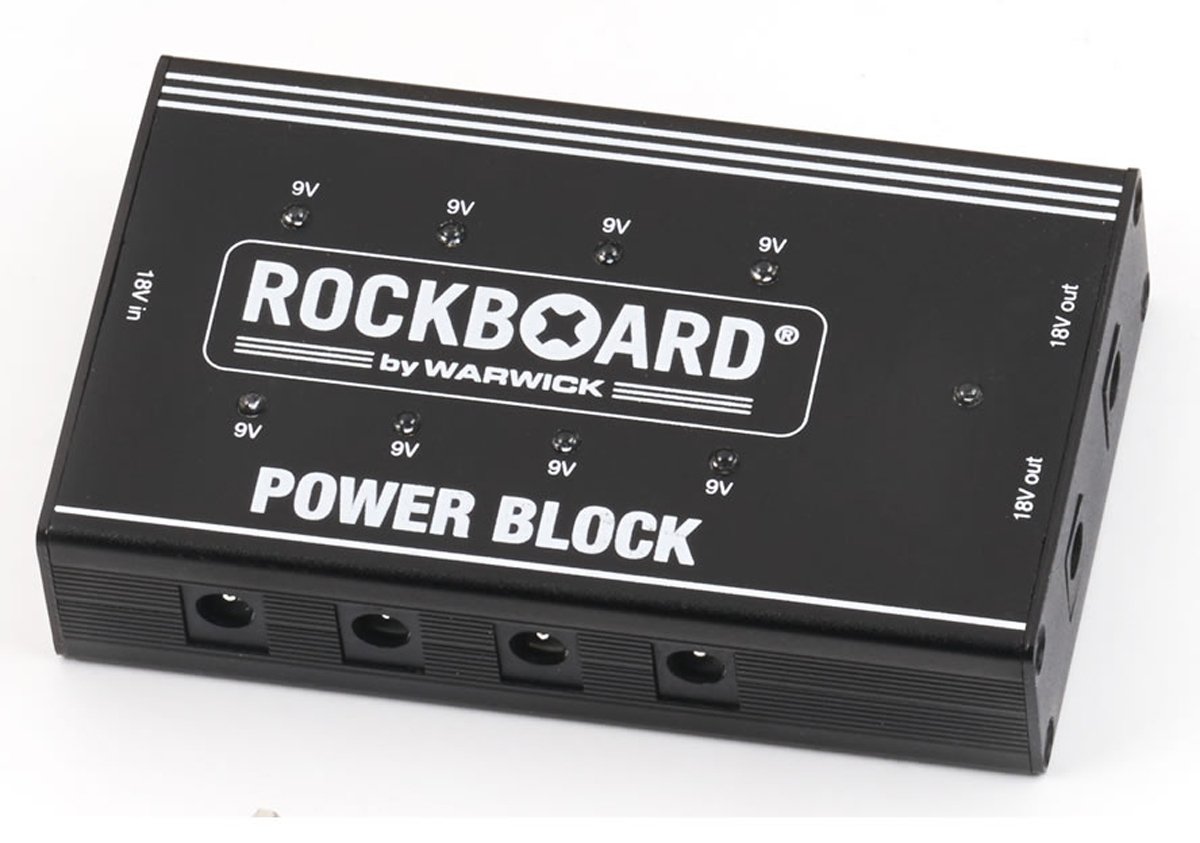Power supply for Rockboard RBO Power Block pedals. The Rockboard RBO Power Block is a 2,000 mA pedal power supply with 8 9V 150mA outputs and 2 18V 400mA outputs. Includes connection cables for effects and power adapter