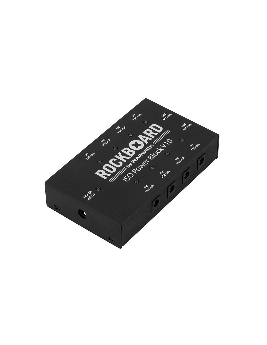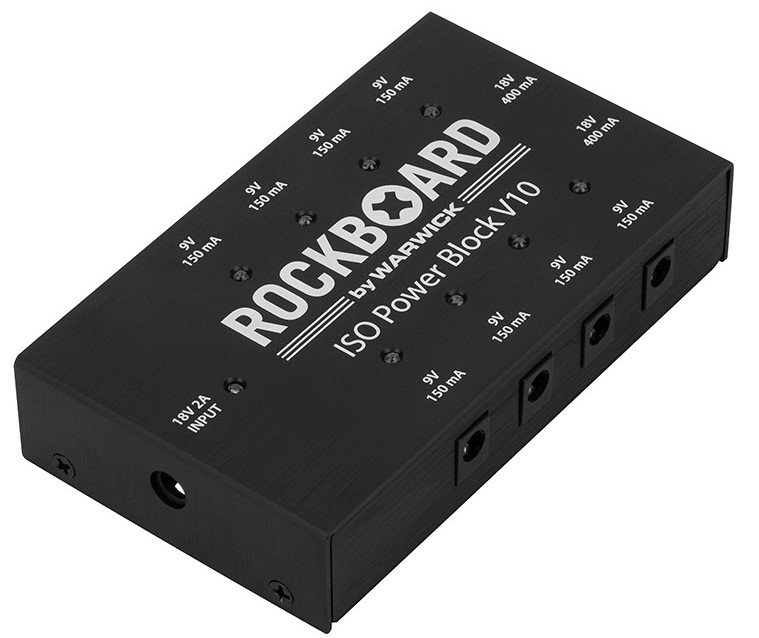 ROCKBOARD RBO POWERBLOCK ISO 10 V2. Multiple pedal power supply with 10 power slots. Technical features include 8 9v slots and 2 isolated 18v slots with high frequency noise filter, integrated short circuit protection with LED indication on each slot. It includes 1 18v DC adapter with universal socket set (EU, UK, USA/CA, AU/NZ), 10 RockBoard power cables, 2 x 20cm “Y” cables to connect 2 slots and double the voltage outputs