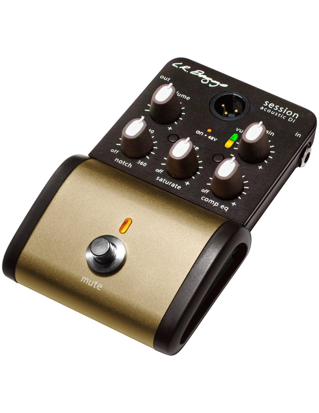 LR Baggs Session DI External Acoustic Guitar Preamp. The LR Baggs Session DI is an external acoustic guitar preamp with Analog Saturation, Compression/EQ, Garret Null notch filter, Variable high-pass filter, VU meter, Ground lift switch, XLR output, 48V phantom power, 9V battery or 9V DC powering, Mute footswitch