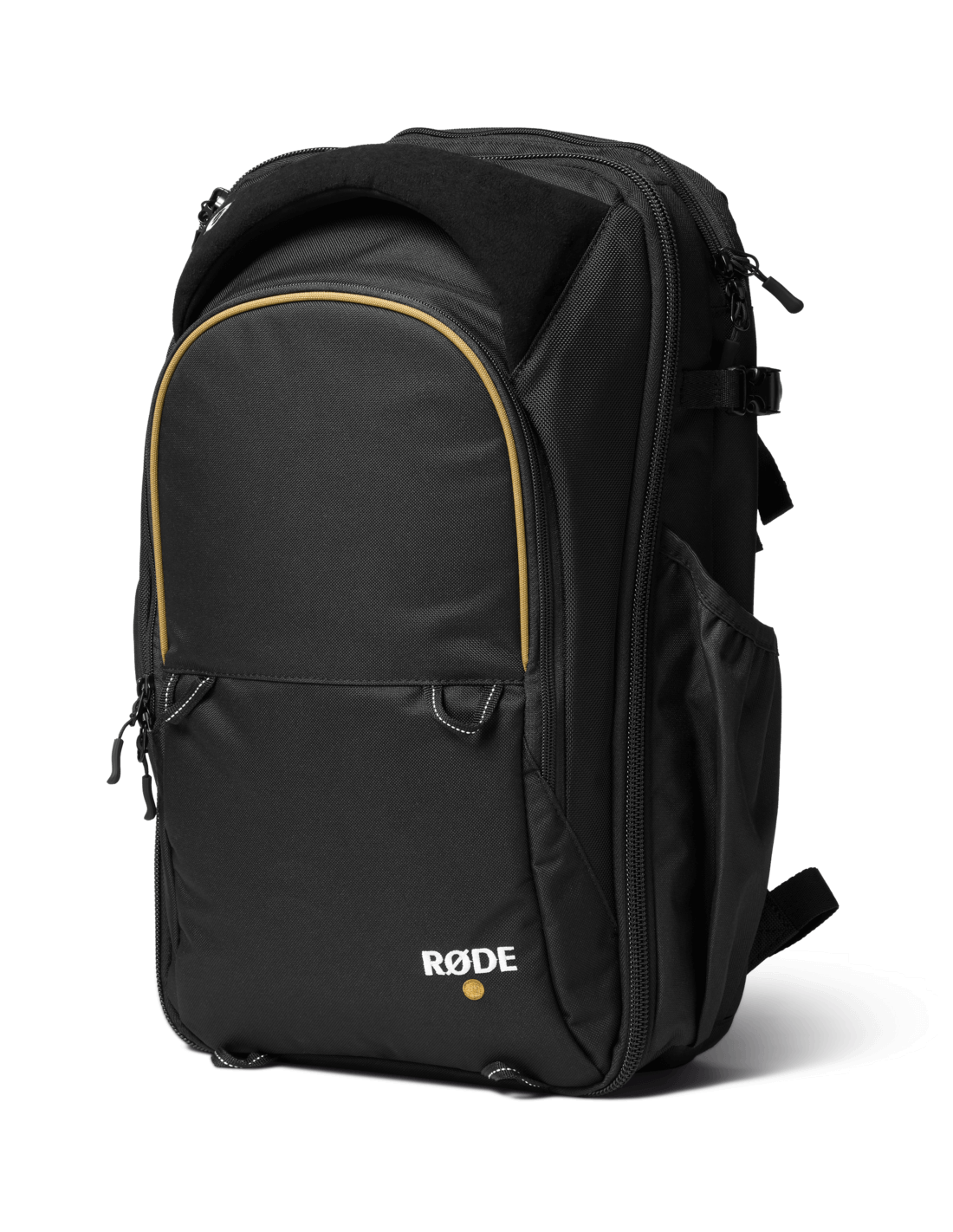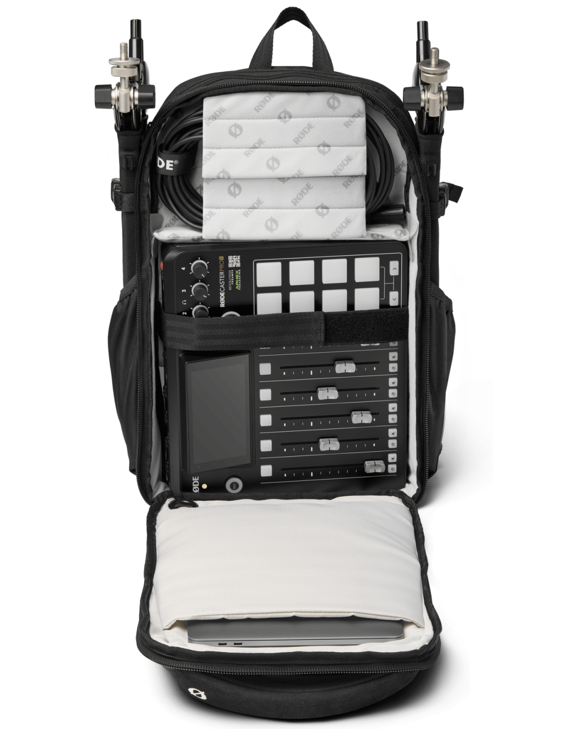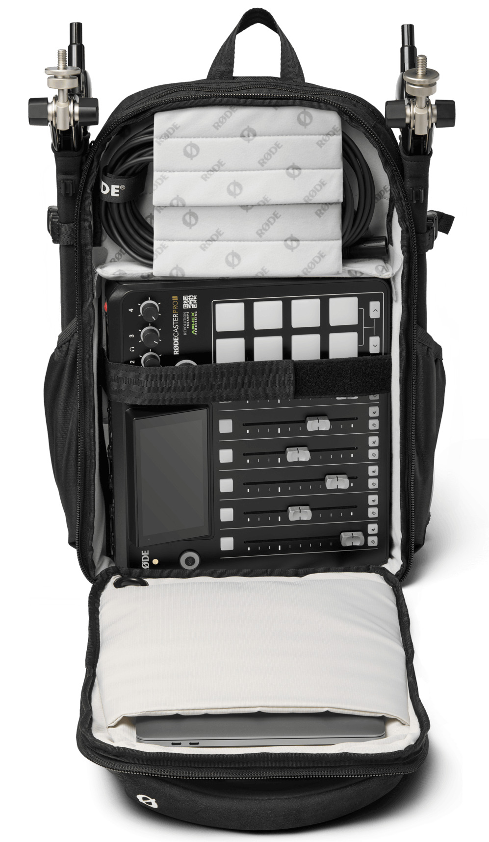 The Rode Back Pack is a backpack designed to carry the RØDECaster Pro or RØDECaster Pro II. It features a padded compartment for laptops up to 16" and compartments for modular equipment, external pockets, ergonomic shoulder straps, back support and sternum strap