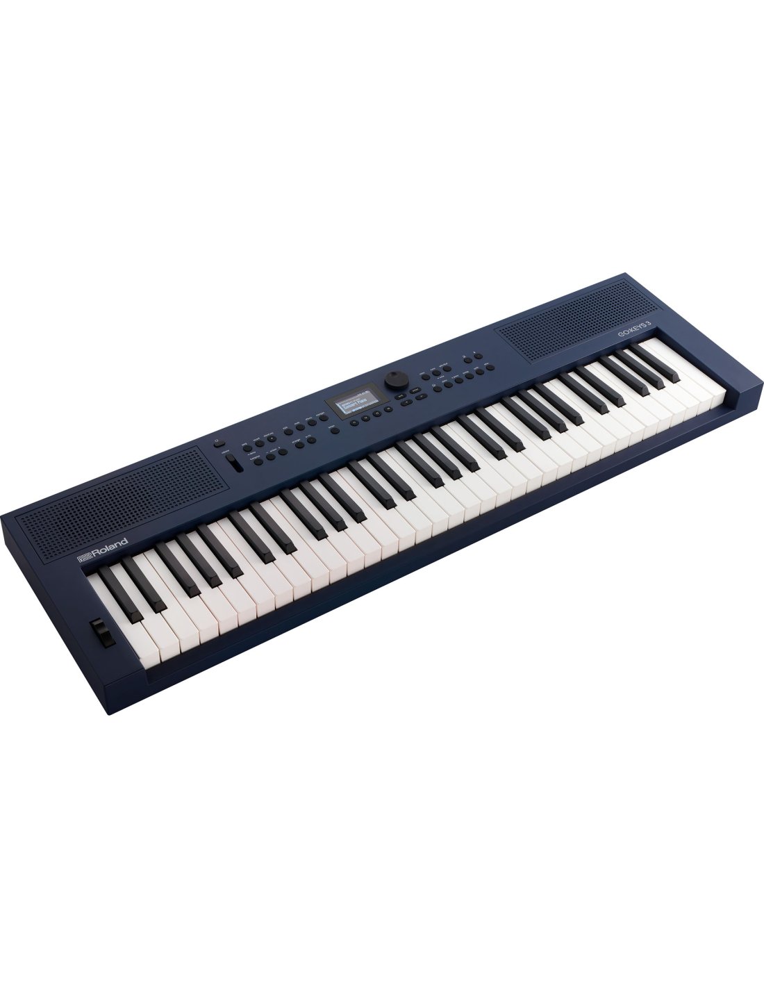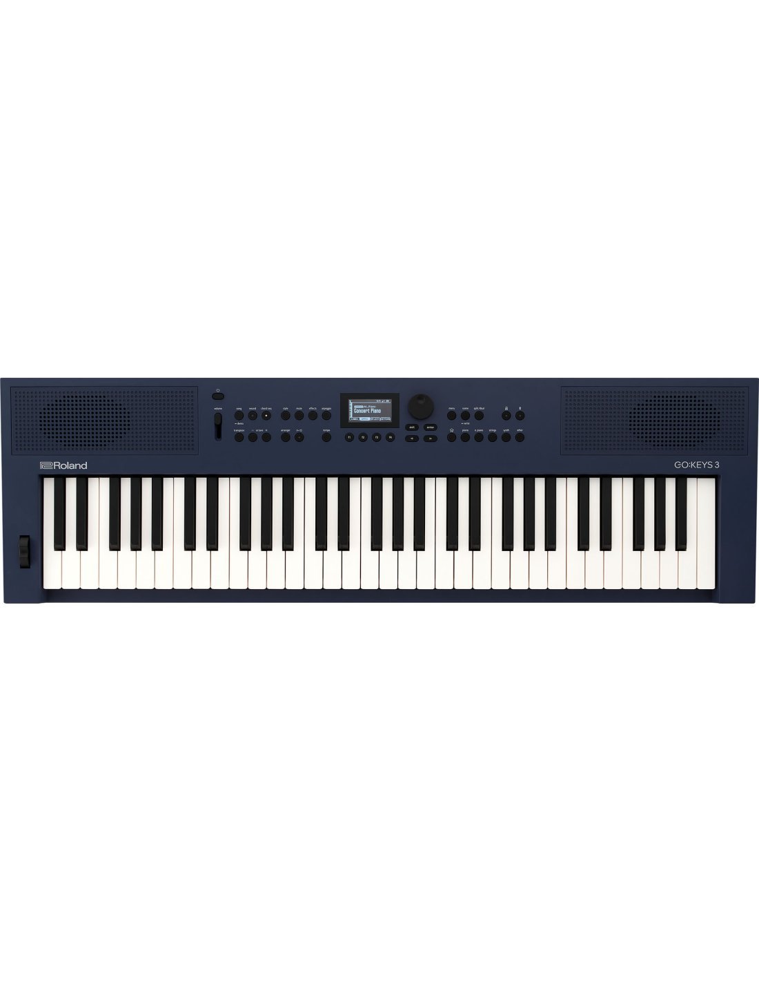 ROLAND GO:KEYS-3-MU MIDNIGHT BLUE is a 61-key full-size keyboard with Aftertouch functionality, Roland GO:KEYS sound engine for a variety of high-quality sounds, including acoustic, electric and other traditional and modern instruments, Loop Mix function to quickly create complete tracks using rhythm loops and preset musical phrases, automatic accompaniment with more than 200 built-in musical styles, editable Chord Sequencer with 300 user presets, integrated Stereo Speakers, USB interface Audio/MIDI, USB/WC-1 slot for backing up and playing audio files, and WC-1 adapter for Roland Cloud Connect support.