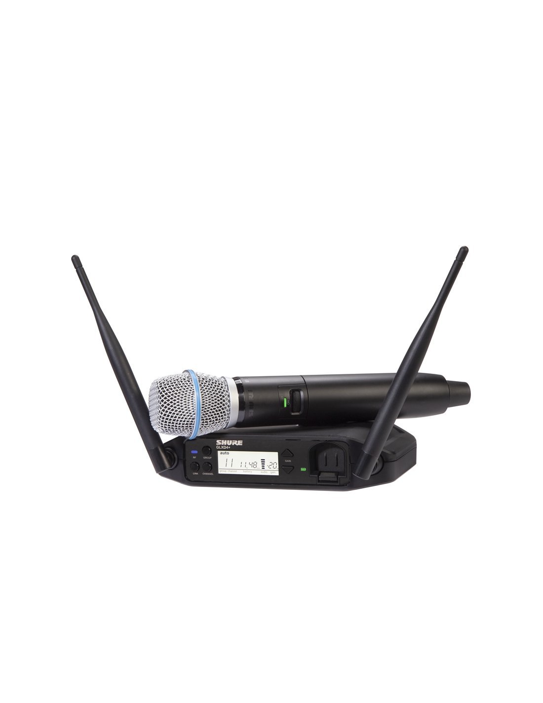 Equipped with the BETA 87A ice cream voice microphone, an established standard on stages around the world, the GLXD24+/B87A dual band voice system (2.4GHz and 5.8GHz) offers quality and extremely stable digital audio. The perfect combination of automatic frequency management with new dual-band technology (2.4GHz and 5.8GHz) ensures reliable and consistent performance, while Shure's proprietary rechargeable lithium batteries provide up to 12 hours of use.
