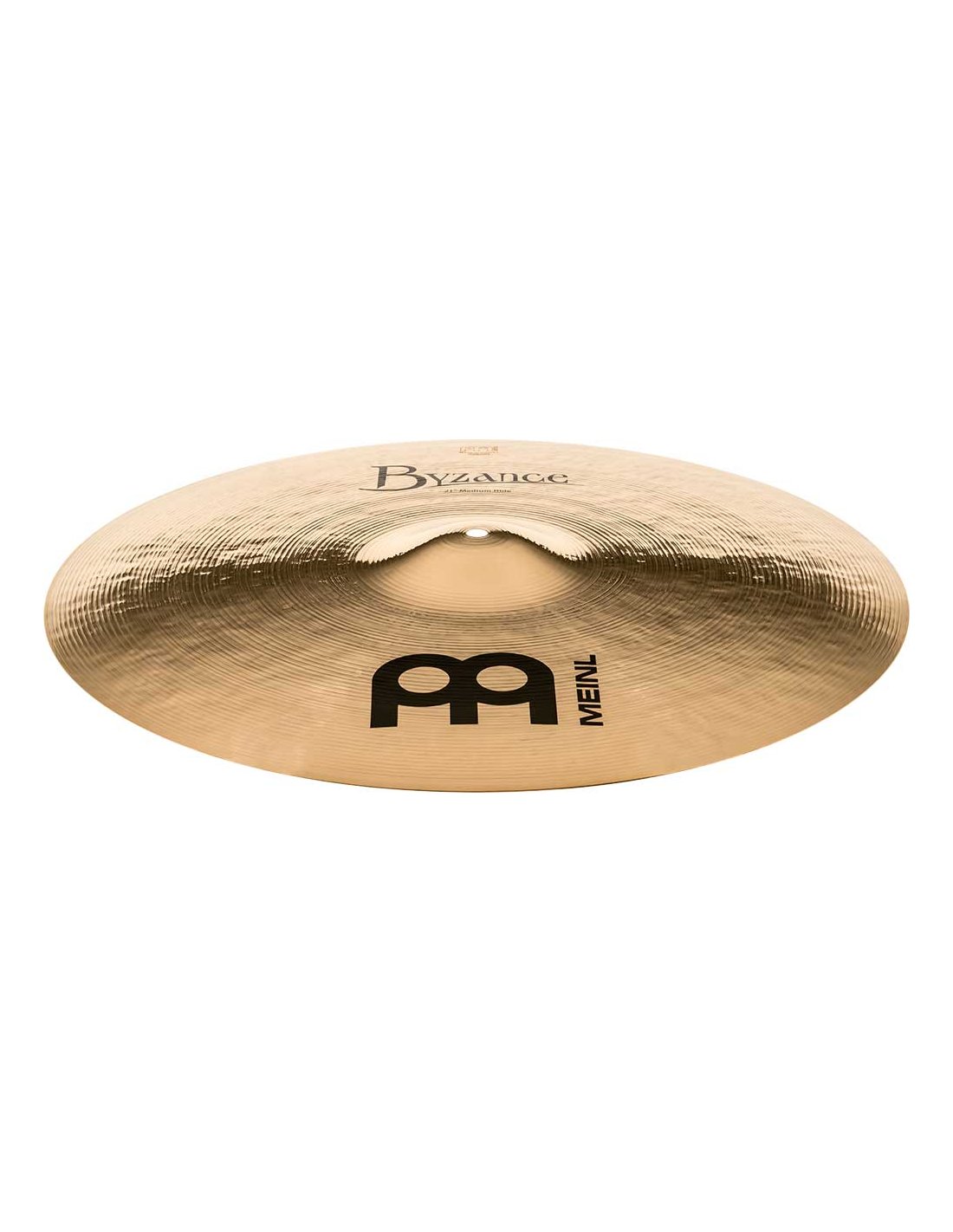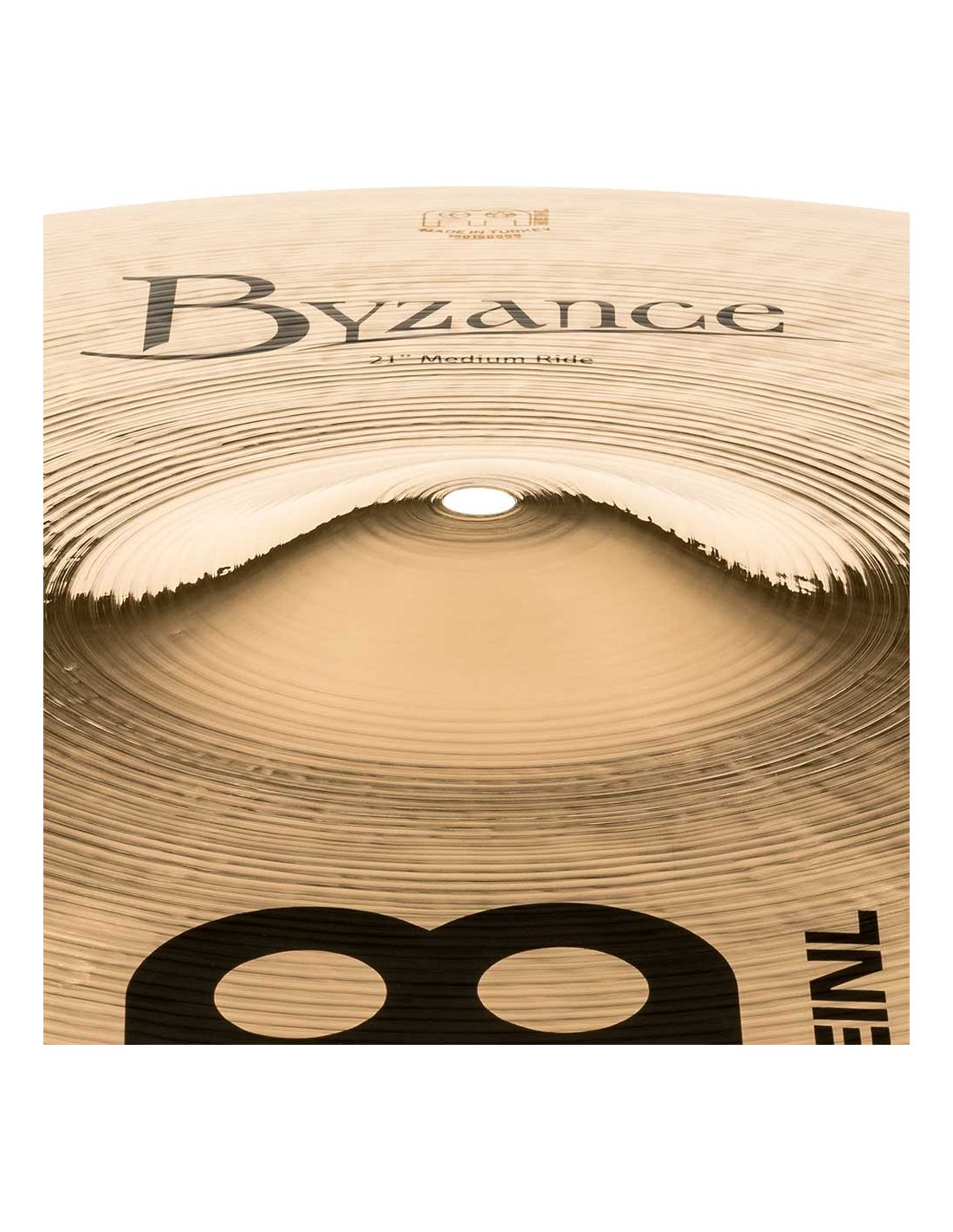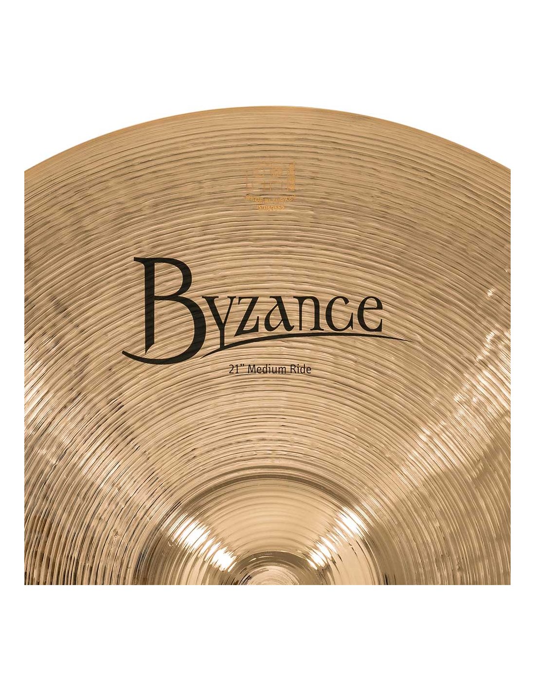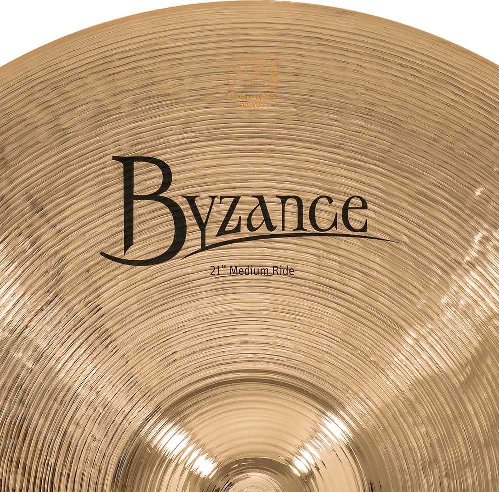 'Ride 21" Medium, Byzance Brilliant Series. The Byzance Brilliant series plates are handcrafted in our factory in Turkey by the hands of specialists and respecting tradition throughout the process. All plates are made with B20 bronze alloy discs. Various techniques are involved in the process, both hammering and turning. In addition to this, they receive a glossy lacquer that gives them a more explosive sound and a spectacular glossy finish.
